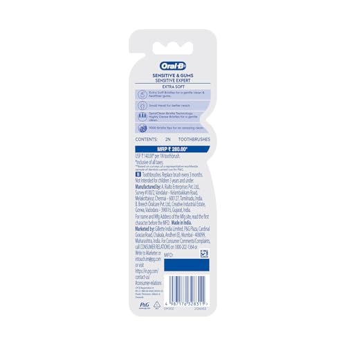Oral B the world's #1 dentist-recommended brand brings you revolutionary brushing solutions with best-in-class technology with proven results for a healtheir cleaner smile. Oral B Sensitive Expert Ultra soft toothbrush with highly dense 9000 bristles gently deep cleans without irritating sensitive gums. Compact head to ensure thorough cleaning by reaching deep between teeth and along the gum line. It helps reduce gum inflammation to promote overall gum health. Perfect for everyday brushing routines ensuring consistent oral hygiene. Designed with an ergonomic handle for comfortable and controlled brushing. Experience a superior clean and healthier gums with Oral B Sensitive Expert toothbrush.