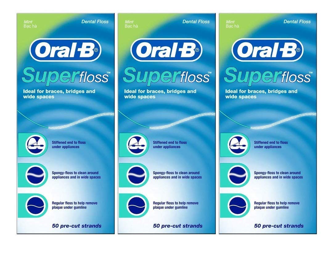 Oral-B Super Floss is ideal for braces bridges and wide spaces between teeth. Its three unique components - a stiffened-end dental floss threader spongy floss and regular floss to remove plaque - all work together for maximum benefits.