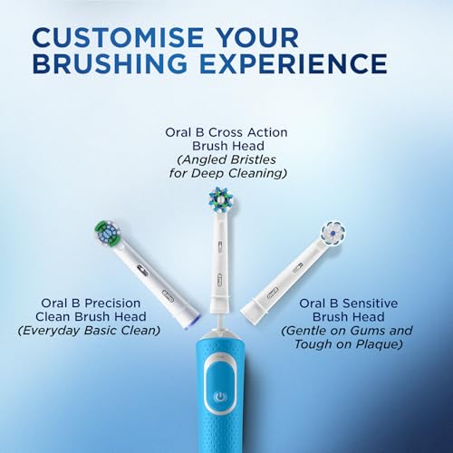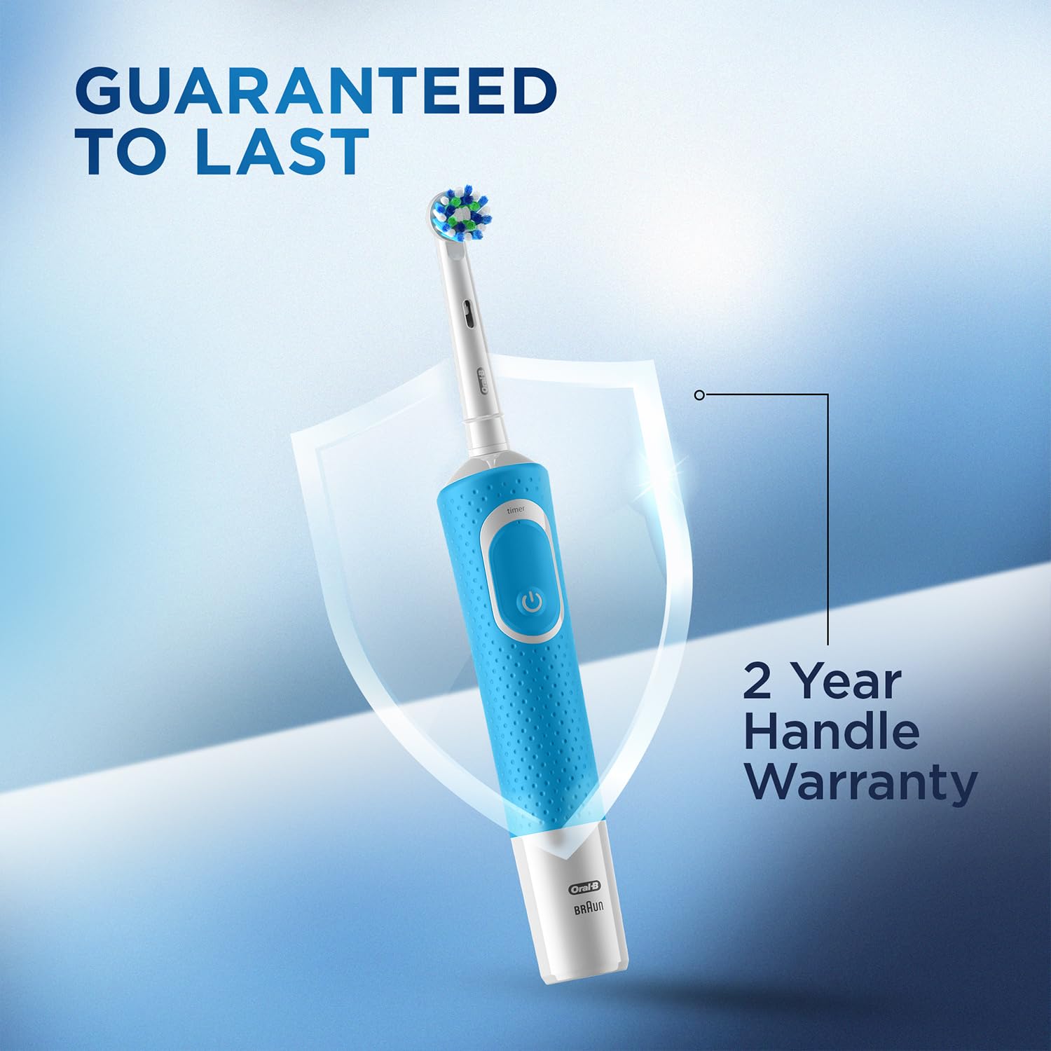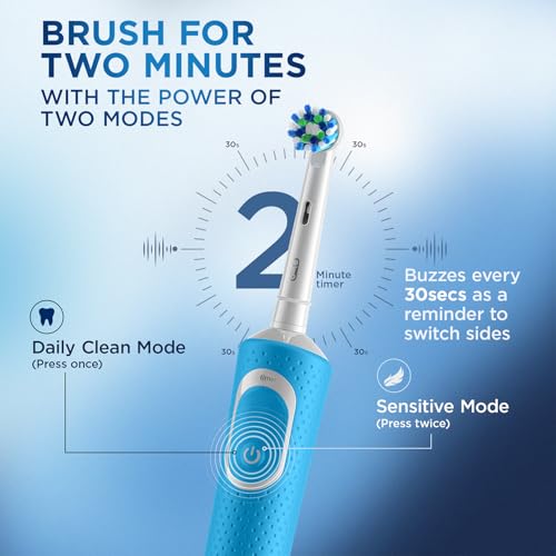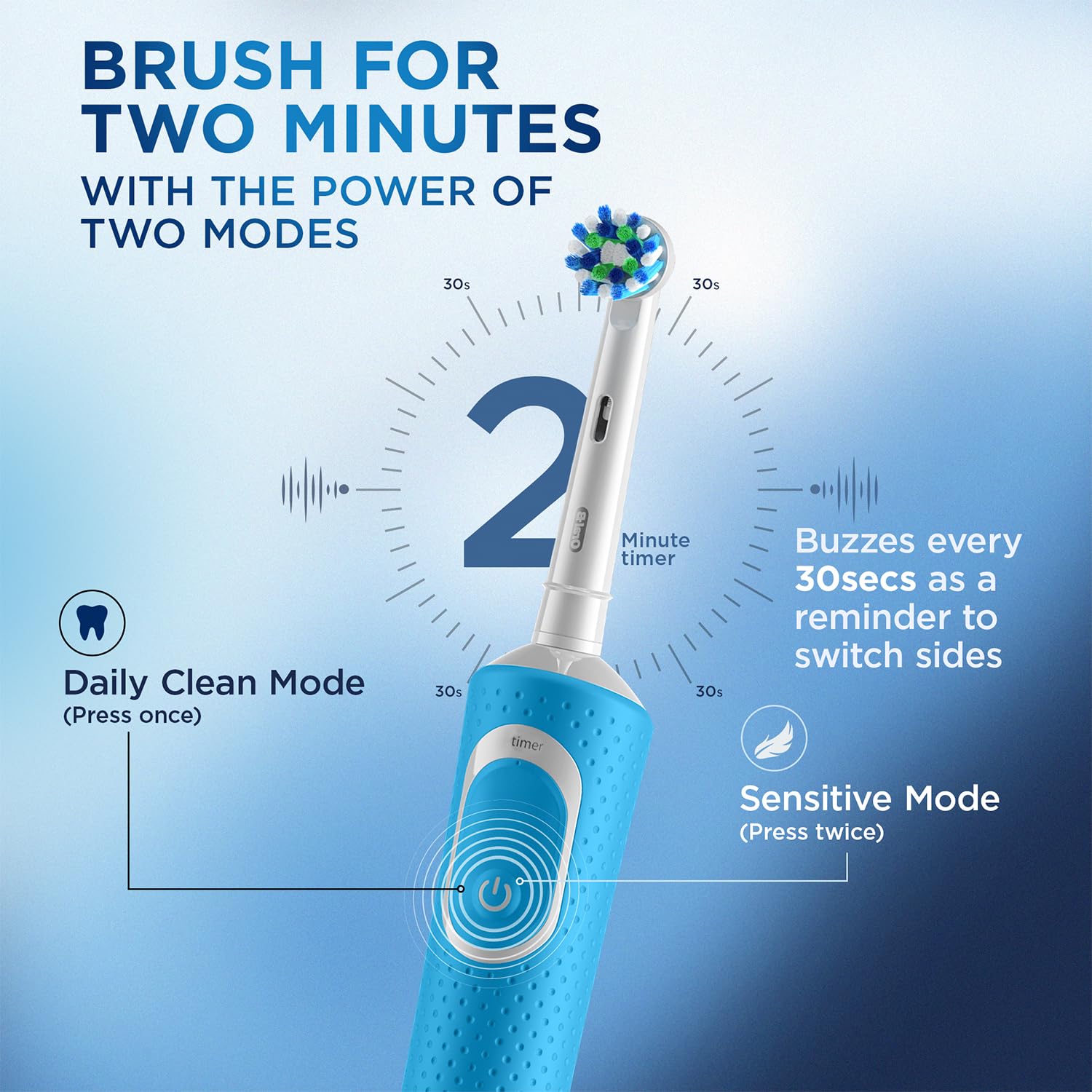 Introducing the Oral-B Vitality Blue Rechargeable Rotating Electric Toothbrush the essential toothbrush for achieving a professional clean. Designed for adults this electric toothbrush offers a superior brushing experience with its 2D Cleaning Action that oscillates and rotates to remove up to 100% more plaque compared to a regular manual toothbrush. The round brush head with crisscross bristles angled at 16 degrees cups each tooth for a more effective clean. Featuring a built-in professional 2-minute quadrant timer it ensures you brush for the dentist-recommended duration vibrating every 30 seconds to alert you to change the brushing area. With two brushing modesDaily and Sensitiveit caters to both regular and sensitive teeth and gums. Waterproof with an IPX7 rating and backed by a 2-year warranty this toothbrush is designed for durability and ease of use. Experience the dentist-inspired round brush head from Oral-B the #1 brand recommended by dentists worldwide and enjoy a 30-day money-back guarantee for a risk-free trial. Make the Oral-B Vitality Blue a part of your daily routine and experience the difference in oral care with advanced plaque removal and improved gum health. Oral B Vitality is compatible with a variety of Oral-B toothbrush heads including CrossAction Precision Clean Sensitive Clean and more offering versatility to suit your specific needs.