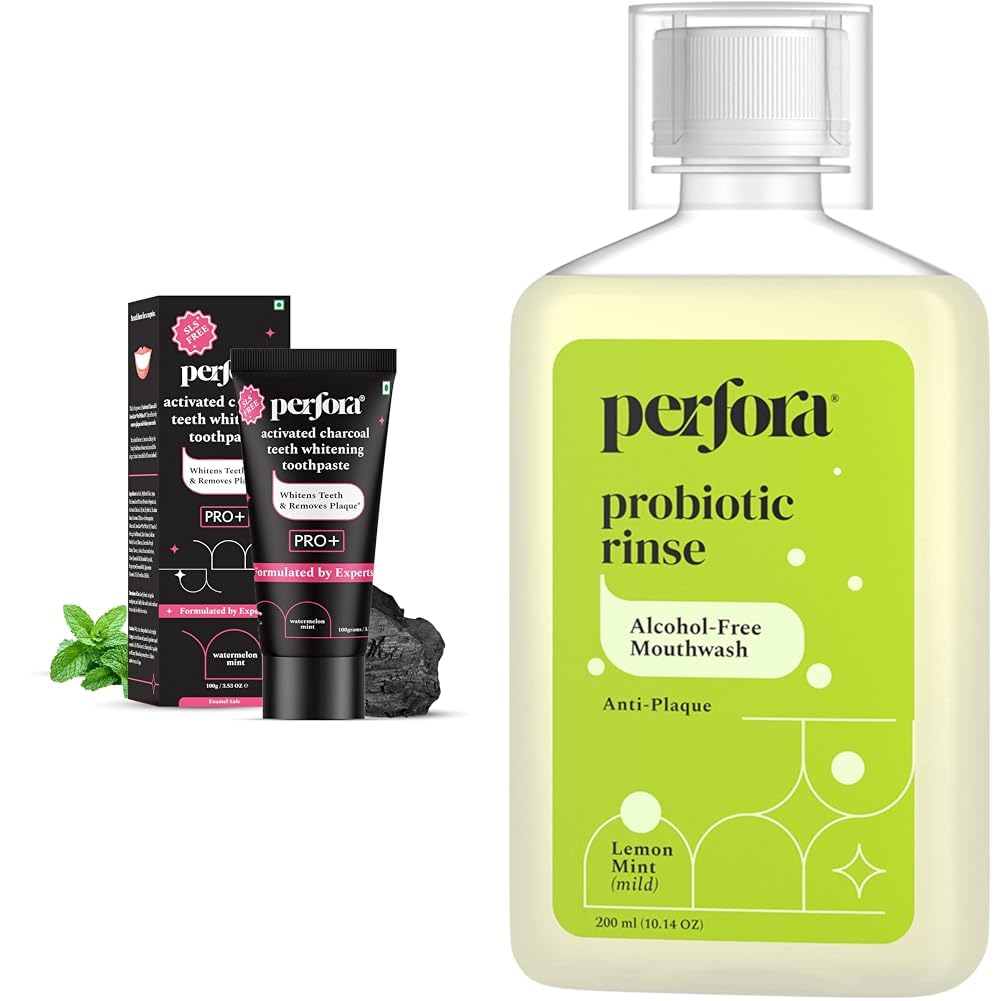 Perfora Probiotic Rinse Alcohol Free Mouthwash + Activated Charcoal PRO+ Teeth Whitening Toothpaste (Watermelon Mint) Combo