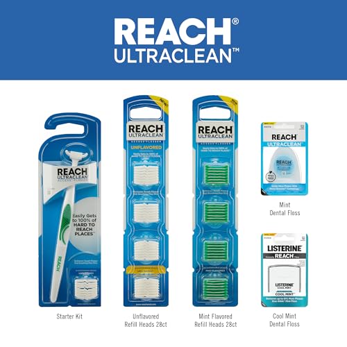 Easily reach between your teeth with the Listerine Ultraclean Access Flosser Refill Heads. This pack of 28 disposable mint flavored floss heads features high-tenacity yarn to withstand breakage. Flossing removes plaque on teeth that brushing may miss and is an important step in your oral care routine. Easily get to 100% of hard to reach places with this floss. For use with the Listerine Ultraclean Access Flosser. Fluoride-Free