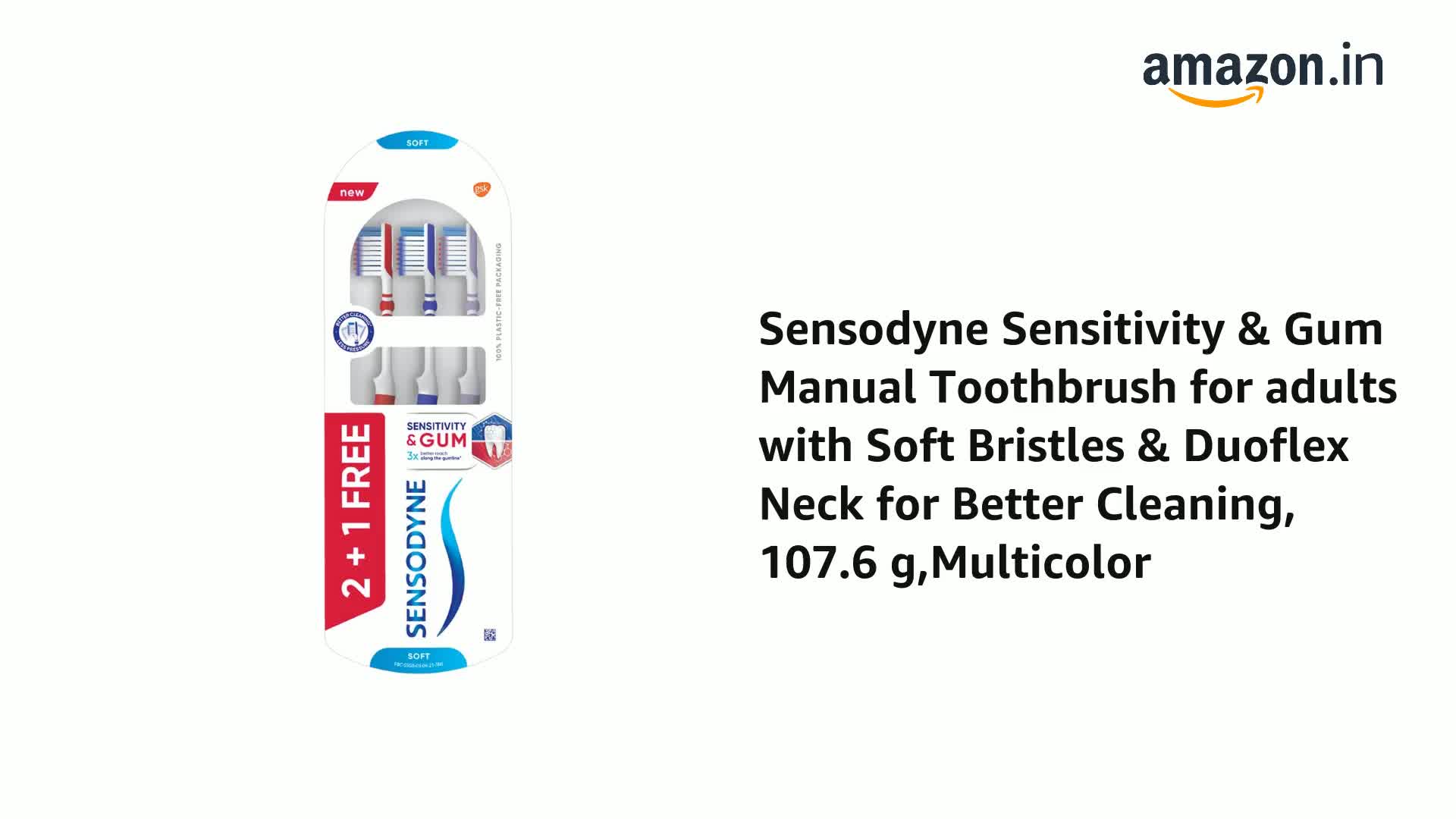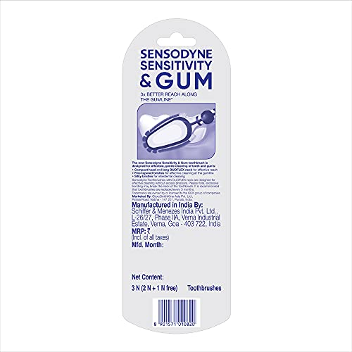 Sensodyne has designed and formulated an entire range of toothbrushes as well as toothpastes to accommodate different needs. Cleaning effectively is important for people especially with sensitive teeth - to help prevent plaque build-up while minimizing further wear and tear that can be caused by excessive brushing. Sensodyne Sensitivity & Gum toothbrush has been specially designed for gentle and thorough cleaning of teeth & gums without need of excess pressure. The bristle design of this brush is uniquely crafted with a mix of round and tapered bristles. Soft rounded bristles provide gentle & effective cleaning while fine tapered bristles allow 3x better reach along the gumline (compared to a standard neck manual toothbrush). This toothbrush also comes with a flexible 'duoflex' neck which bends when extra pressure is applied during brushing & thereby protects against overbrushing. The carton and window used in the packaging of this brush are 100% plastic free and therefore recyclable. Sensodyne Sensitivity & Gum tooth brush is available in two packs - Single (1 piece) and Triple pack (3 pieces - Buy 2 Get 1 free). Brush your teeth gently twice a day to avoid plaque build-up. It is recommended to change your toothbrush every three months. For optimal care of tooth sensitivity we recommend brushing in combination with Sensodyne toothpaste twice a day.