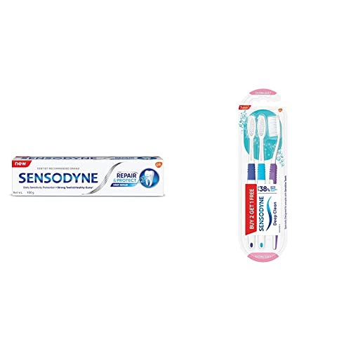 Sensodyne Toothpaste Repair & Protect tooth paste for deep repair of sensitive teeth 100 gmWhen the protective layer of teeth (enamel) is worn away or gums recede the dentine underneath becomes exposed. When the exposed dentine comes in contact with hot cold sweet or sour food and drinks it can trigger a sharp short sensation called tooth sensitivity. Sensodyne Repair & Protect is a daily fluoride toothpaste that helps to repair and protect the sensitive areas of teeth while still providing the benefits of a regular paste like strong teeth and health gums. The paste is powered by Novamin a unique calcium formulation that helps to repair sensitive areas with the natural building blocks of teeth. The paste also builds ongoing protection with every brush so that you can enjoy your favorite foods and drinks without the worry of sensitive teeth. Sensodyne Repair & Protect Deep Repair tooth paste is available in three packs - 70 gm 100 gm and 140 gm (70 gm * 2) combo pack. Brushing twice a day provides protection from tooth sensitivity. Always follow instructions and guidance included on the pack before use.Sensodyne Toothbrush: Deep Clean toothbrush with extra soft & microfine bristles 3 pieces (Buy 2 Get 1 free)Sensodyne has designed and formulated an entire range of toothbrushes as well as toothpastes to accommodate different needs. Cleaning effectively is important for people especially with sensitive teeth - to help prevent plaque build-up while minimizing further wear and tear that can be caused by excessive brushing. Sensodyne Deep Clean toothbrush is specially designed for gentle yet thorough cleaning of teeth. This toothbrush has extra soft silky bristles that provide effective cleaning of teeth while being gentle on teeth and gums. The dense bristle base of the brush helps remove plaque effectively while the micro-fine tapered filaments provide deep cleaning between the teeth (up to 38% better reach in between the teeth) and along the gumline (up to 4x better reach along the gumline) compared to a flat trim manual toothbrush. Sensodyne Deep Clean tooth brush is available in two packs - Single (1 piece) and Triple pack (3 pieces - Buy 2 Get 1 free). Brush your teeth gently twice a day to avoid plaque build-up. Do not brush too hard as applying too much pressure can lead to overbrushing. It is recommended to change your toothbrush every three months. For optimal care of tooth sensitivity we recommend brushing in combination with Sensodyne toothpaste twice a day.