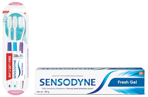 Sensodyne Toothpaste Fresh Gel Sensitive tooth paste for daily sensitivity protection 150 gmWhen the protective layer of teeth (enamel) is worn away or gums recede the dentine underneath becomes exposed. When the exposed dentine comes in contact with hot cold sweet or sour food and drinks it can trigger a sharp short sensation called tooth sensitivity. Sensodyne Fresh Gel is a daily fluoride toothpaste that helps protect against tooth sensitivity while still providing the benefits of a regular paste like strong teeth and health gums. It also has a cool refreshing taste that leaves your mouth feeling fresh and clean. With twice daily brushing you can enjoy your favorite foods and drinks without the worry of sensitive teeth. Sensodyne Fresh Gel tooth paste is available in four packs - 75 gm 150 gm 450 gm (150 gm * 3) and 450 gm (150 gm - Buy 2 Get 1 free) combo pack. Always follow instructions and guidance included on the pack before use.Sensodyne Deep Clean Manual Brush Super Saver Pack for adult (Multicolor Pack of Buy 2 Get 1 Free)Sensodyne has designed and formulated an entire range of toothbrushes as well as toothpastes to accommodate different needs. Cleaning effectively is important for people especially with sensitive teeth - to help prevent plaque build-up while minimizing further wear and tear that can be caused by excessive brushing. Sensodyne Deep Clean toothbrush is specially designed for gentle yet thorough cleaning of teeth. This toothbrush has extra soft silky bristles that provide effective cleaning of teeth while being gentle on teeth and gums. The dense bristle base of the brush helps remove plaque effectively while the micro-fine tapered filaments provide deep cleaning between the teeth (up to 38% better reach in between the teeth) and along the gumline (up to 4x better reach along the gumline) compared to a flat trim manual toothbrush. Sensodyne Deep Clean tooth brush is available in two packs - Single (1 piece) and Triple pack (3 pieces - Buy 2 Get 1 free). Brush your teeth gently twice a day to avoid plaque build-up. Do not brush too hard as applying too much pressure can lead to overbrushing. It is recommended to change your toothbrush every three months. For optimal care of tooth sensitivity we recommend brushing in combination with Sensodyne toothpaste twice a day.