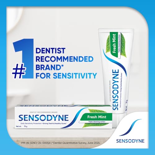 When the protective layer of teeth (enamel) is worn away or gums recede the dentine underneath becomes exposed. When the exposed dentine comes in contact with hot cold sweet or sour food and drinks it can trigger a sharp short sensation called tooth sensitivity. Sensodyne Fresh Mint is a daily fluoride toothpaste that helps protect against tooth sensitivity while still providing the benefits of a regular paste like strong teeth and health gums. It also has a mint flavor that keeps your mouth feeling fresh and clean. With twice daily brushing you can enjoy your favorite foods and drinks without the worry of sensitive teeth. Sensodyne Fresh Mint tooth paste is available in four packs - 75 gm 150 gm 450 gm (150 gm * 3) and 450 gm (150 gm - Buy 2 Get 1 free) combo pack. Always follow instructions and guidance included on the pack before use.