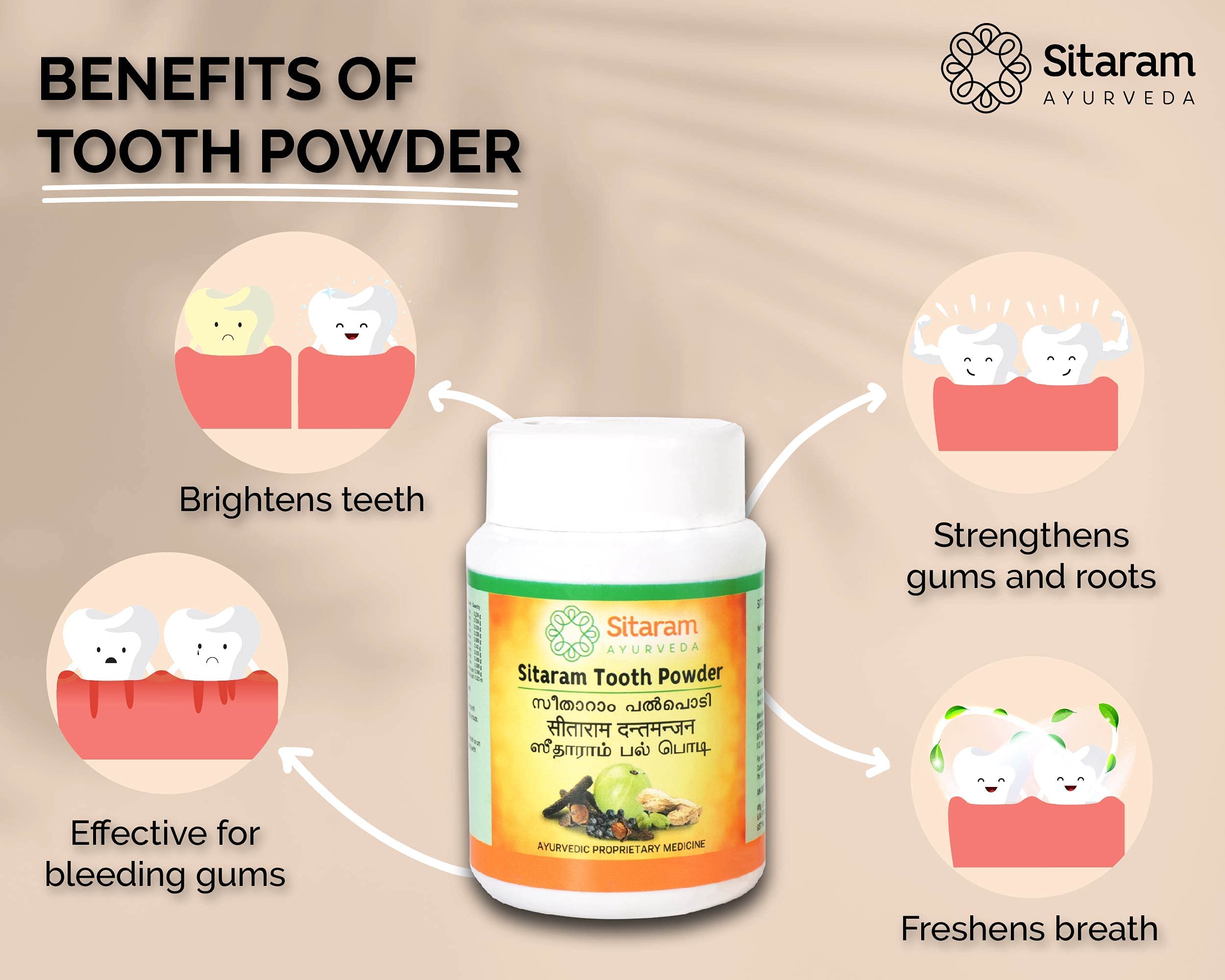 • Sitaram Ayurvedic tooth powder is a unique blend of herbs with time-tested efficacy in maintaining oral hygiene. White bark Acacia or Arimeda Jathiphala (Myristica fragrans) and Lavanga are the key ingredients in this combination which cleanse the oral ca