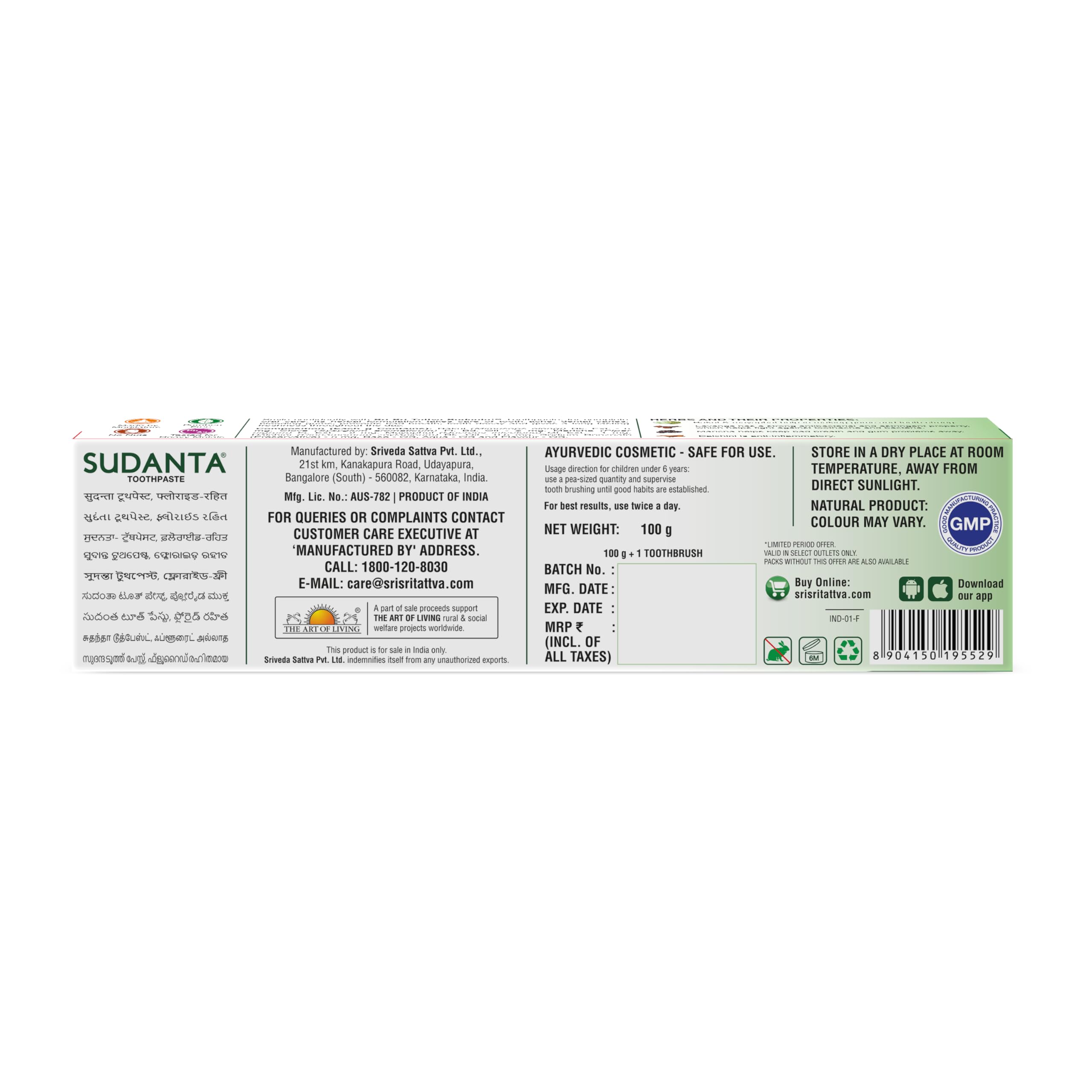 Sri Sri TATTVA shuddhta ka naam Herbal Toothpaste With Smile Toothbrush Free-All Natural Freshness Fluoride Free Tooth Paste With Cloves Cinnamon Bakul & More - 100G (Pack Of 1) For Kids & Adults