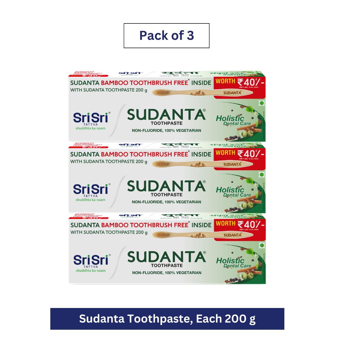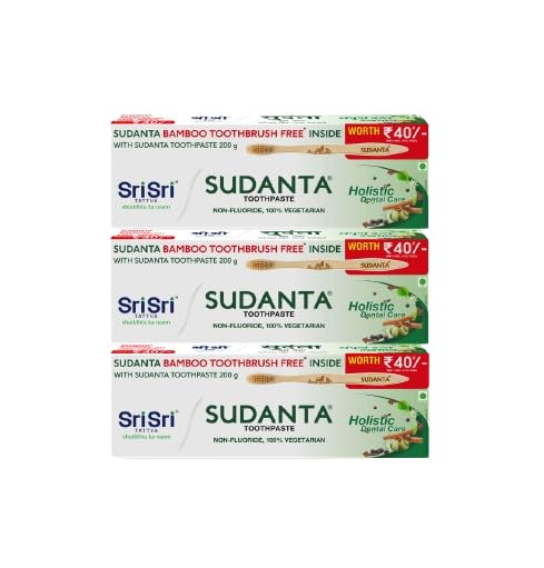Sri Sri TATTVA shuddhta ka naam Sudanta Herbal Antibacterial Toothpaste With Bamboo Toothbrush Free Inside | Non - Fluoride | 100% Vegetarian | Each 200 G X Pack Of 3