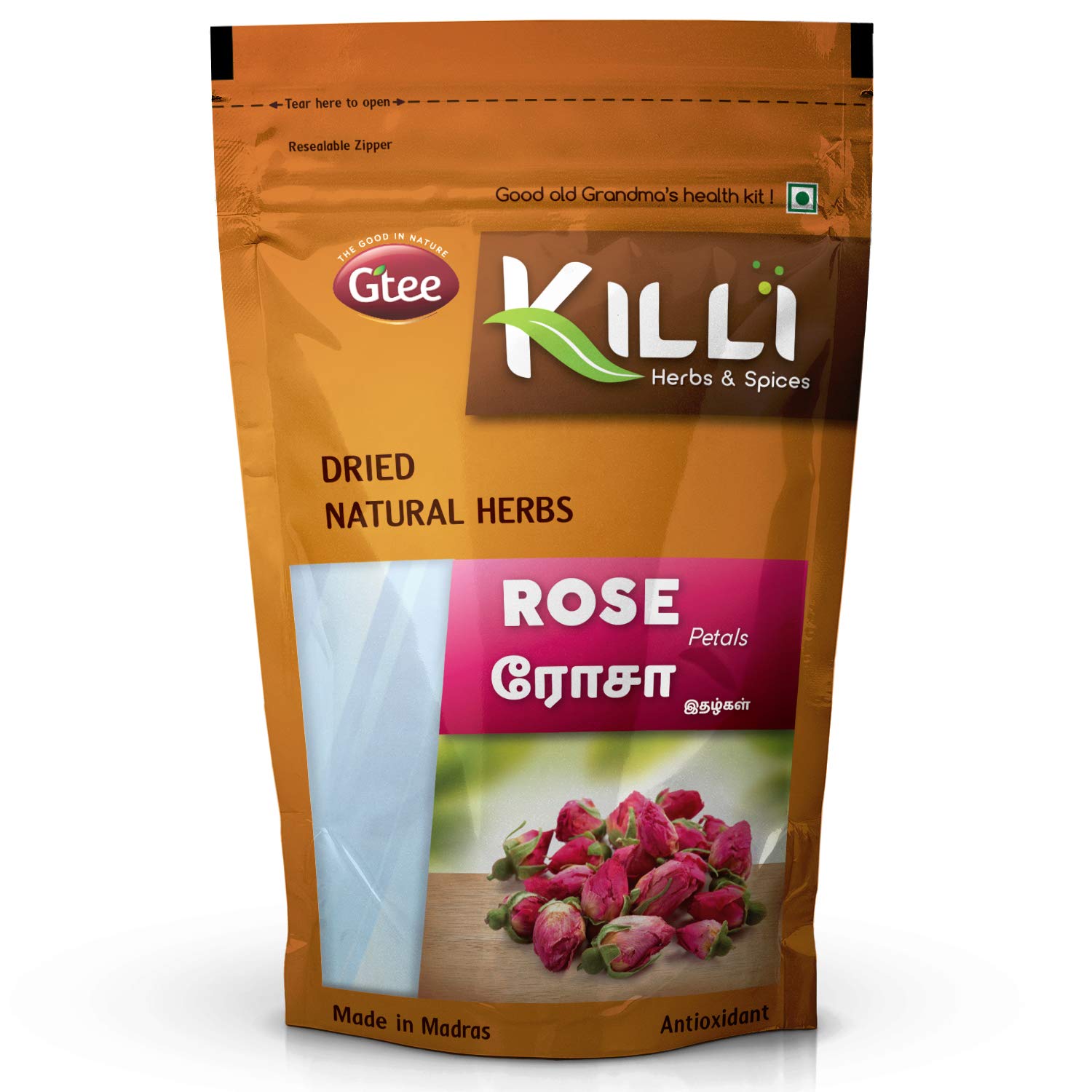 KILLI ROSE PETALSHEALTH BENEFITSRose petals gives a healthy delicious and relaxing beverage. The delicate pink flowers create a beautifully fragrant fruity and nutritious infusion rich in natural antioxidant. It helps to ease menstrual pain rejuvenate hair and skin improves digestion relieves cold aids weight loss reduces stress and improves immunity.HOW TO MAKEMix 20 to 25 Killi Rose Petals with 150ml of hot water wait for 2-3 minutes and serve. 3 to 5 drops of honey can be added to support weight loss if required.KILLI HERBS & SPICESKILLI having its special care and scientific approach in every stop of processing of herbs to retain the active principle taste and aroma explores the value of traditional herbs with uncompromising quality and taste to customers. We believe that the traditional wisdom is the wealth of our Nation. KILLI's unique herbal combinations offers its customers the best healthy solutions. KILLI is a Registered Trademark of Gtee