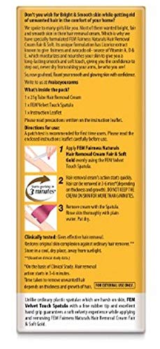 1. Apply fem fairness naturals removal cream fair and soft evenly using the new velvet touch spatula 2.Hair removal cream's action starts quickly hair can be removed in 3-6 mins