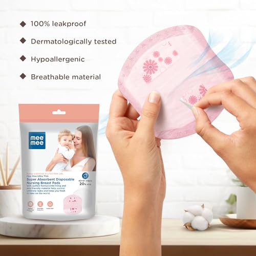 Mee Mee's Ultra Thin Super Absorbent Disposable Nursing Pads you can stay fresh and comfortably clean. The pad has a contoured shape with multiple layers that have unique moisture channels. The silky soft top-sheet has a one-way flow barrier that traps the leaks leaving your skin dry and clean.