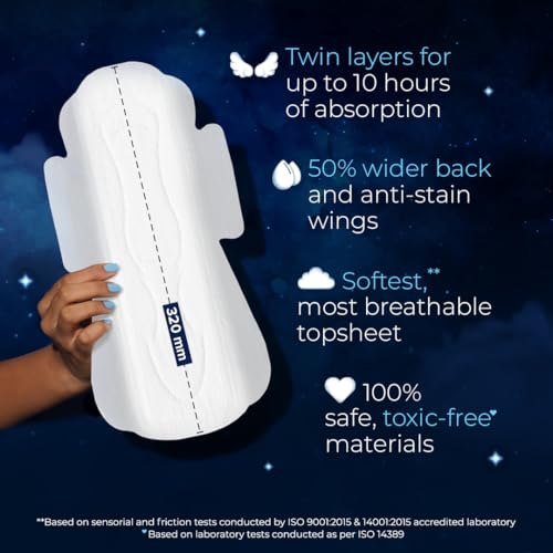 • Safe on skin - Our overnight pads are formulated without any harmful chemicals or dyes ensuring rash-free and safe leakage protection all night.
