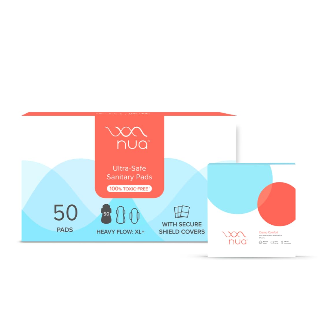 Nua Sanitary Pads For Women | Safe on Skin | Toxic-Free & Rash-Free | Unscented | 50 Ultra Thin Pads | Heavy Flow-XL+ | Leakproof | With 50 Paper Disposal Pouches | 50% Wider back| Made Safe| Bulk Pack|Nua Ultra Thin Sanitary Pads with the new and improved design are made of superior quality non-woven fabric with a super-absorbent core. The sanitary pads do not have any harmful chemicals prints or perfume on the top layer to avoid rashes and come with wider backs for full coverage. The pack contains 50 Heavy (XL - 320mm) Pads and comes in paper based hygienic disposal covers for a hassle-free period experience. Nua is Made Safe Certified by Safe Cosmetics Australia. Safe Cosmetics endorses brands that pledge to exclude and restrict potentially toxic and irritating chemicals and clinically test their formulations to ensure that they are free from contaminants and are suitable for application to human skin. Nua follows ethical manufacturing processes which means from supply chain to laboratory all ingredients are safe and healthy and we consider it the single most important factor in establishing good practices and building consumer trust.""" establishing good practices and building consumer trust.Nua Cramp Comfort - Pack of 3 Heat Patches for Period Pain and Cramps || 100% Natural Ingredients and Portable || 8 Hours Pain Relief || Quick Relief from Menstrual PainNua Cramp Comfort is a self-heating patch inspired by the function of a hot water bag for cramps during periods. This latest Nua product will not only offer relief to your period pain but also provide a portable solution to carry it outdoors. The patch is made with 100% natural and effective ingredients and does not contain any harmful chemicals. The patch should be applied to the underwear and not directly on the skin. Heat is a natural and effective way to reduce pain. So the patch can be left on as it emits soothing heat for 8 hours and provides instant relief. The portable and discreet feature of the patch allows you to wear it under your clothes to relieve you from menstrual pain. Lastly once the patch cools down simply cut one of its sides and empty the contents in wet waste and the outer cover in dry waste.