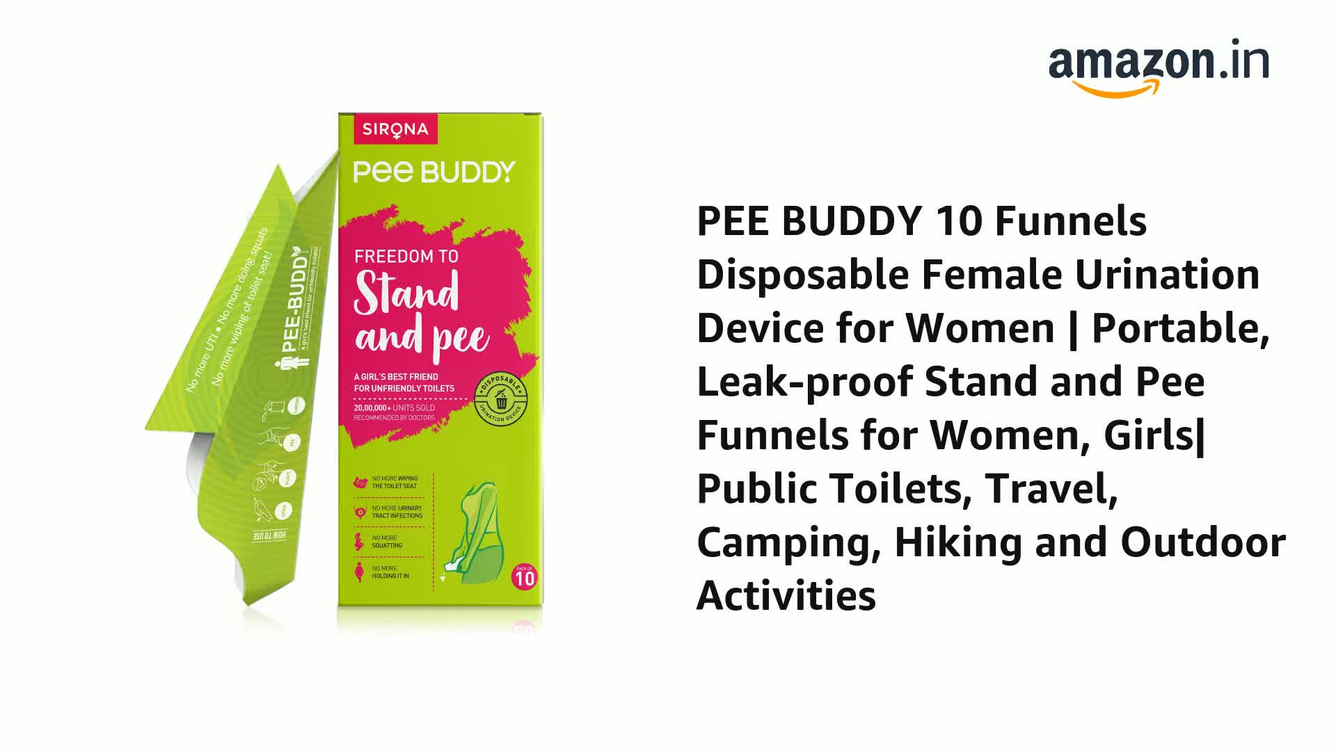 Made in India Peebuddy is India's first portable disposable female urination device for women using which women can stand and urinate in all public and common toilets. It is a revolutionary product for women who hate dirty toilets when travelling fights or train or highways for work or leisure treks marathons road trips events or those with medical condition joint pains or pregnancy. Using Peebuddy you can simple stand and pee and avoid all utis or infections or yucky experiences at dirty toilets. It comes with simple open place pee throw instructions and is very convenient to use with no spills. Now use Peebuddy and stay away from infections uti. No more wiping of seat no more squats no more holding it in. Its a quality product by Sirona.