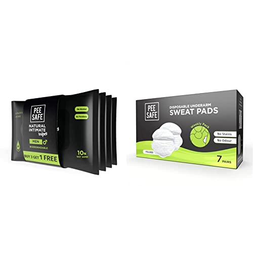 Pee Safe Intimate Wipes for Men Biodegradable pH balanced - 40 Wipes (Pack of 4)Pee Safe Intimate Wipes for men are crafted to maintain your intimate hygiene. These wipes are made from bamboo pulp and extremely soft and comfortable to use. It cleans and refreshes your intimate area without any hassle and can be used before and after sexual activity or after urination. Intimate wipes for men are enriched with the goodness of Tea Tree oil and perfect for keeping you fresh at any time of the day. The unique composition of Intimate Wipes for men ensures proper care with a skin-friendly pH with Aloe vera Extracts as a natural moisturizer. Along with Tea tree oil and Aloe vera extract the Pee Safe Intimate Wipes formulation comprises of Calendula oil which has natural properties that help to get rid of unpleasant odour caused by microbes.Pee Safe Disposable Underarm Sweat Pads - Folded | Prevents Stains | Absorbs Sweat & Unpleasant Odour | Breathable And Deodorizing | For Men & Women | Pack Of 14Pee Safe Disposable underarm pads is a solution to all your problem related to underarm sweat. It a must-have for people with hyperhidrosis and even individuals who enjoys sports. The soft texture of the pads is breathable and deodorizing in nature hence the pad is invisible from the outside of your clothes.