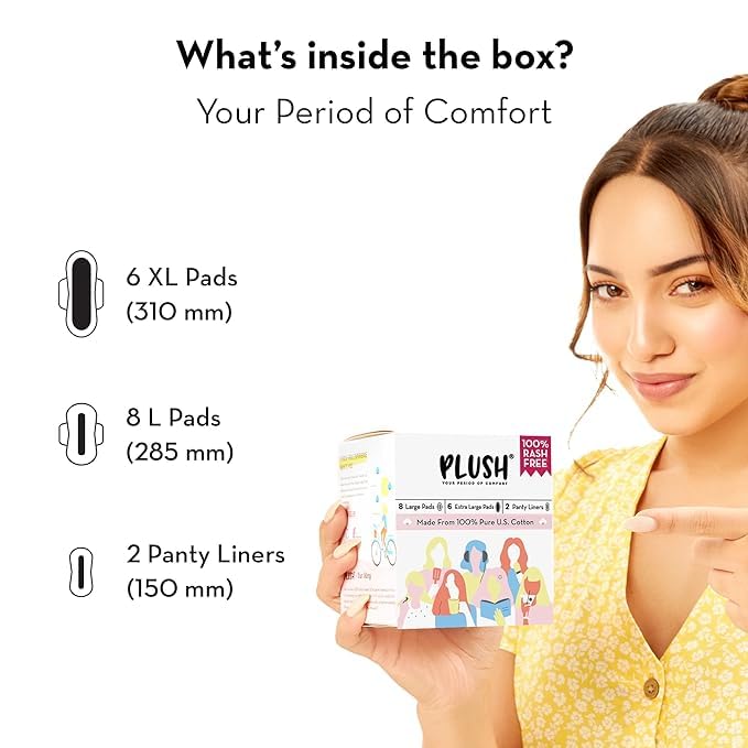 Plush 100% Pure U.S. Cotton 14 Sanitary Pads + 20 Panty Liners for Women | 8 Light Flow Pads (L) 6 Heavy Flow (XL) | Ultra-Thin, Rash Free | Pure Cotton Top Sheet