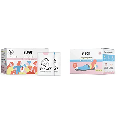 Plush Sanitary Napkin/Pads for Women with Disposable Pouches | Pack of 30 | 14 Heavy Flow Pads 16 Medium Flow Pads Pads & 4 Light Flow Pads | 100% Pure U.S. Cotton Ultra-Thin Rash Free | For Normal-Sensitive Skin | VeganMade from Pure U.S. Cotton Plush Pads are ultra-thin super absorbent aimed at providing you a complete rash-free experiencePlush Daily Ultra Thin Panty Liners for Women 40 Liners-150mm in Length | 100% Pure US Cotton Provides All Day Freshness | For Non-Period Days and Spotting | All Vegan & Paraben Free | All Skin TypeThese daily panty liners are made of cotton material. It has count of 40 (2*pack of 20). It is ideal for women.
