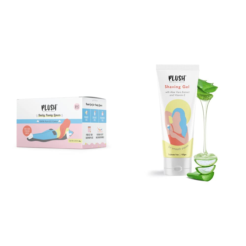 Plush Daily Ultra Thin Panty Liners for Women 40 Liners-150mm in Length | 100% Pure US Cotton Provides All Day Freshness | For Non-Period Days and Spotting | All Vegan & Paraben Free | All Skin TypeThese daily panty liners are made of cotton material. It has count of 40 (2*pack of 20). It is ideal for women.Plush All Natural Shaving Gel for Women with Aloe Vera & Vitamin E Extracts | Free from Sulphates & Parabens | 100% Vegan | Best for Smooth Shaves & Moisturizing | For Normal-Sensitive Skin - 100 GMSPlush All Natural Shaving Gel with Aloe Vera and Vitamin E Extracts | Free from Sulphates and Parabens | 100% Vegan | Best for Smooth Shaves and Moisturizing | Designed for Normal-Sensitive Skin - 100 GMS