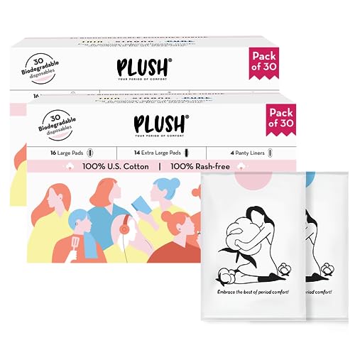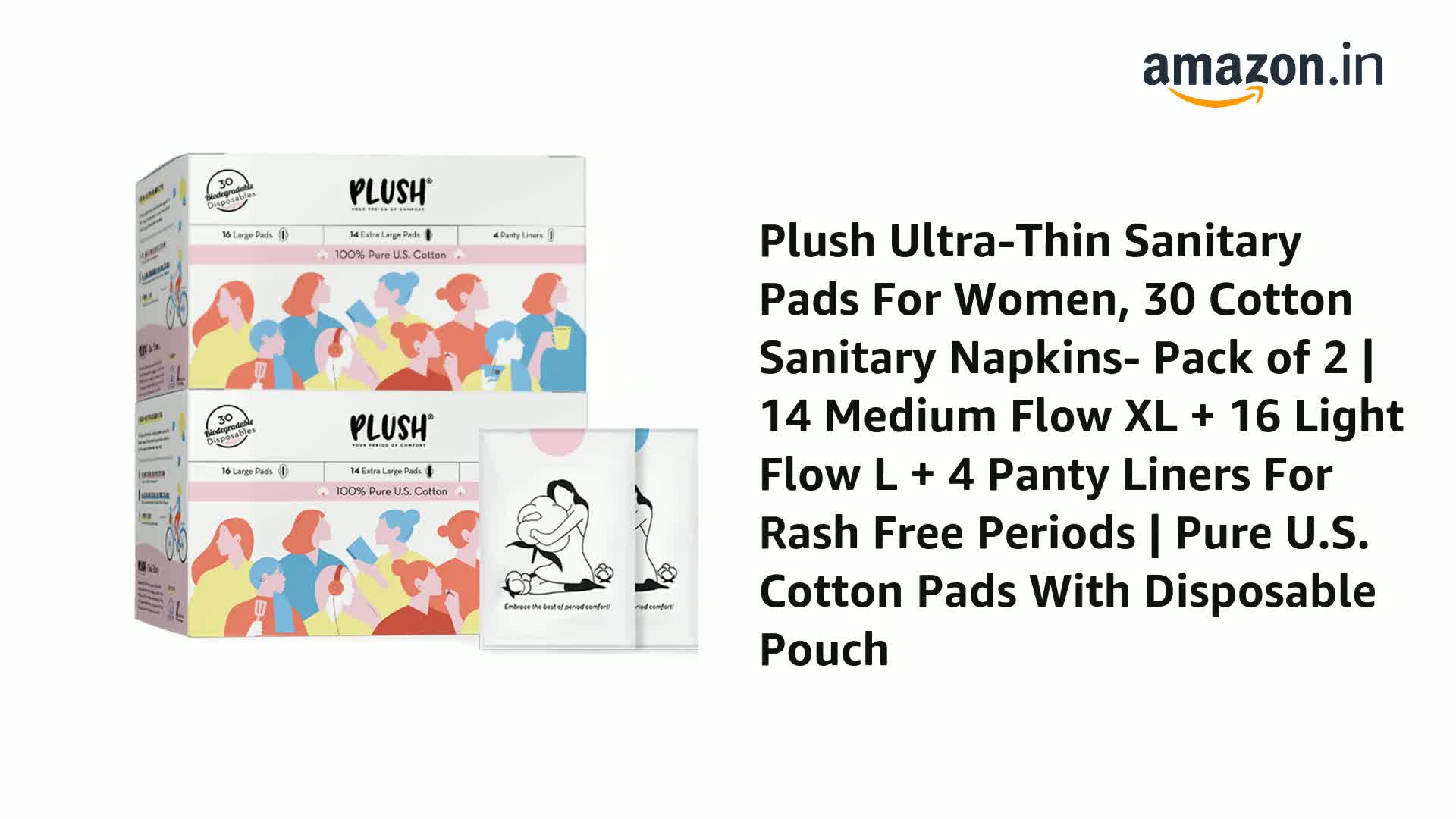 Plush Ultra-Thin Sanitary Pads For Women, 30 Cotton Sanitary Napkins- Pack of 2 | 14 Medium Flow XL + 16 Light Flow L + 4 Panty Liners For Rash Free Periods | Pure U.S. Cotton Pads With Disposable Pouch