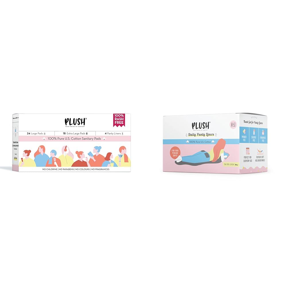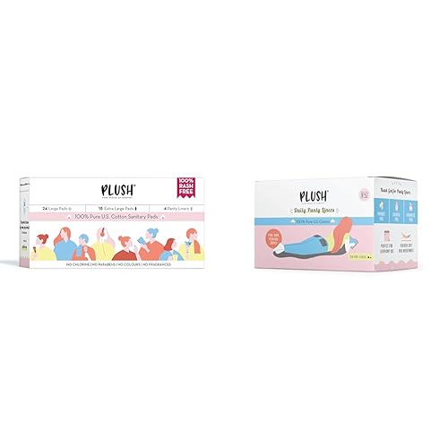 Plush Ultra-Thin Sanitary Pads For Women 42 Cotton Sanitary Napkins | 18 Medium Flow XL + 24 Light Flow L + 4 Panty Liners For Rash Free Periods | Pure U.S. Cotton PadsCrafted with 100% Pure U.S. Cotton the Plush Ultra-thin Natural Sanitary Pads are designed to give you hassle-free and leak-free periods. Super smooth and breathable our feather-light design is created with innovative multi-layer absorption technology to keep you feel secured. You can now comfortably say good-byes to those rashes thanks to our Pure US Cotton topsheet which adapts effortlessly to your underwear and offers a rash-free experience throughout. Each pad of this variant now comes with an individual biodegradable pouch for easy carry and disposal. Free of fragrance paraben and chlorine we always wish to provide natural ingredients which provide real performance.Plush Ultra Thin Panty Liners For Women Daily Use 40 Liners 150mm | Pure US Cotton Liner Pads For Rash Free Periods | Soft Cotton Surface For Comfort On Non-Period Days | No Toxins & Paraben FreeThese daily panty liners are made of cotton material. It has count of 40 (2*pack of 20). It is ideal for women.