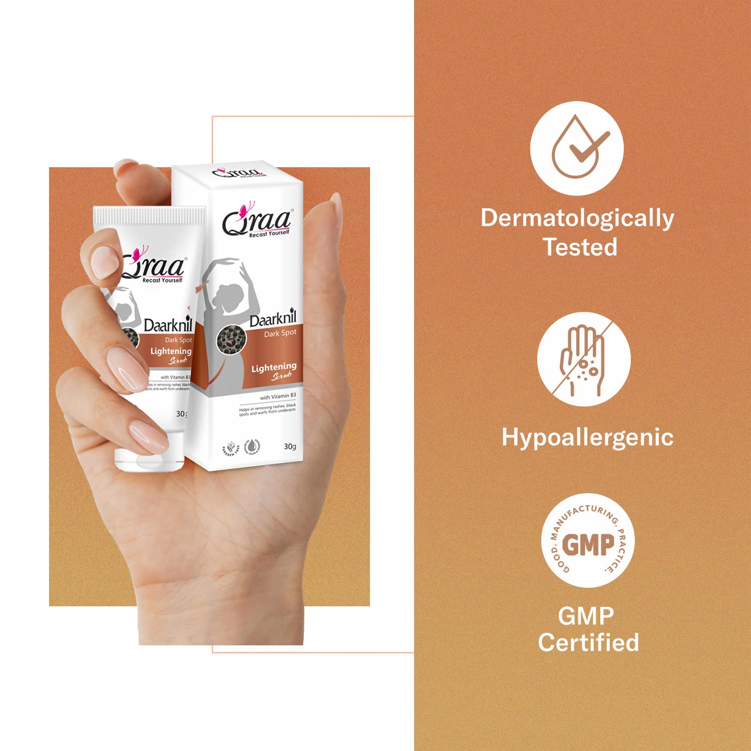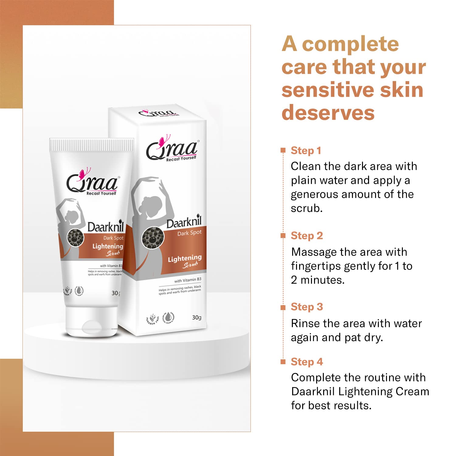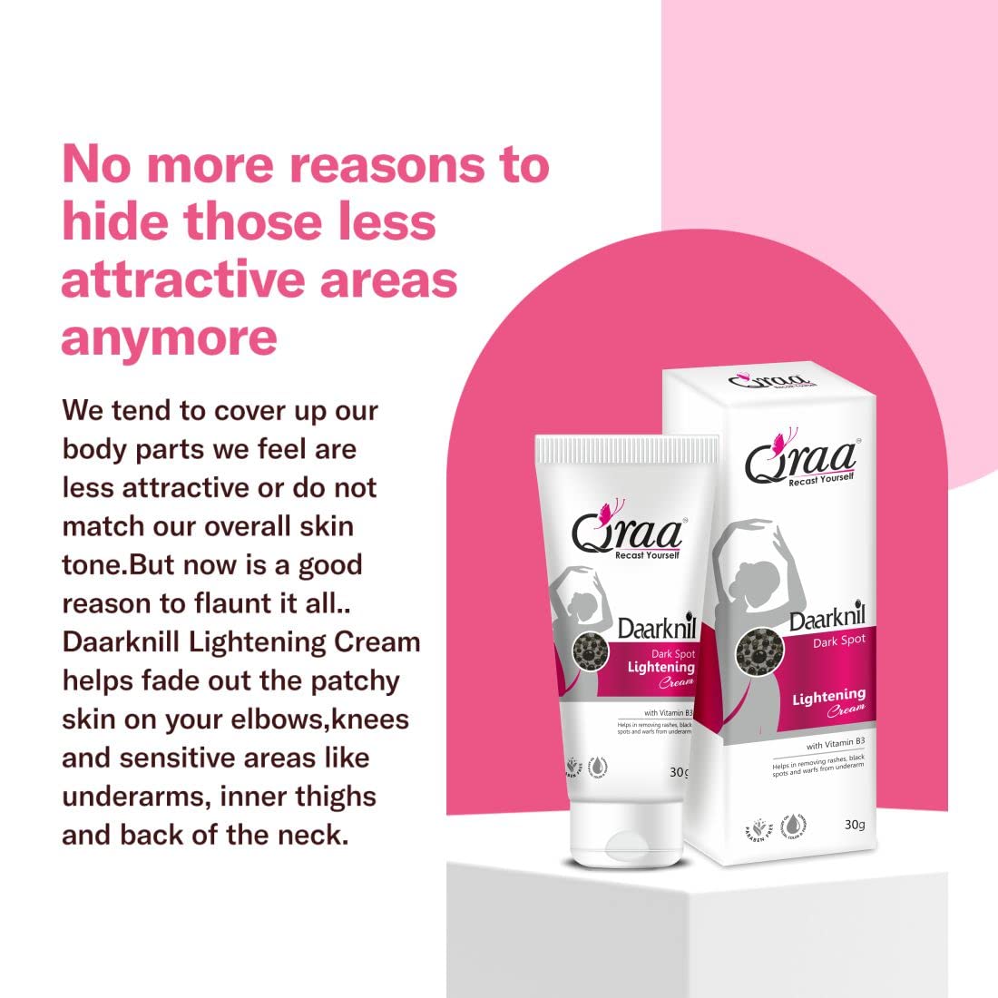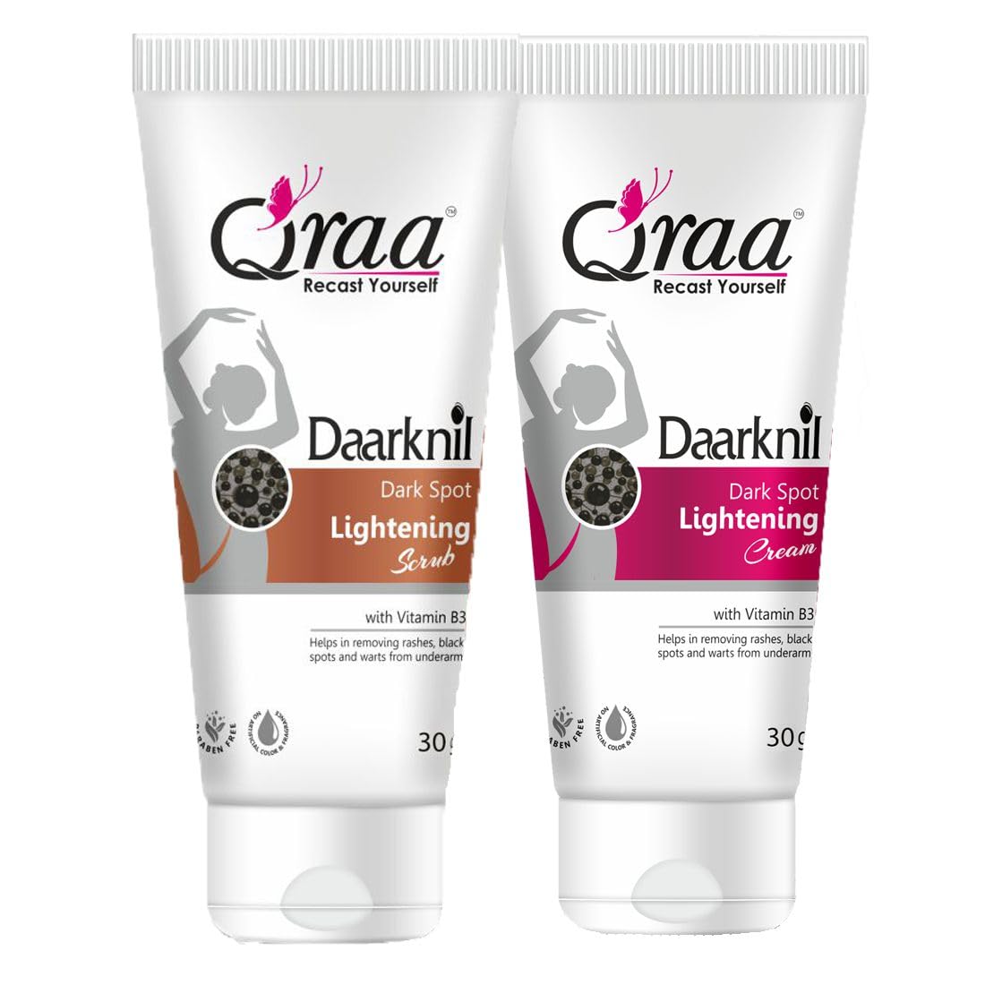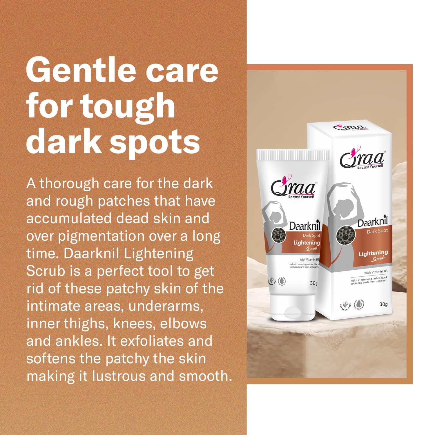 Qraa Daarknil Dark Spot Cream is an advanced formulation that s melanin production and soothes skin to reveal fairer and lighter skin tone. These products can be used on the neck underarms knees elbows knuckles and thighs. Qraa Daarknil Dark Spot Skin Polisher. This new age scrub makes it super easy to remove dark patches of skin from your knees elbows neck and inner thighs. It is made with natural ingredients that have the power to effectively polish the rough darkened skin. The primary function of this product is to exfoliate and polish the skin to remove the dead skin layer that has formed throughout the years. Qraa Daarknil Dark Spot Skin Polisher is made with the power of Citrus Lemon Peel Licorice Root Aloe Vera Leaf Shea Butter Coconut Oil and Olive Oil. The combination of these ingredients have a powerful cleansing and exfoliating effect on dark spots. Ingredients Citrus Lemon Peel- citric acid in the lemon peel is a powerful cleanser and polisher for all skin types. Licorice Root- licorice lightens the appearance of micro-scars in the dark patches and helps hyperpigmentation. Aloe Vera Leaf- a known soothing ingredient aloe vera makes the healing part of the exfoliator and s . Shea Butter- it locks the hydration into the skin and makes it supple. Preventing the accumulation of dead skin cells because of drying up. Coconut Oil- it acts as an emollient preventing the skin from damage and repairing the cell regeneration qualities of skin. Olive Oil- acts as a second barrier for the skin preventing drying up and cracking of the skin it o supports cell regeneration.