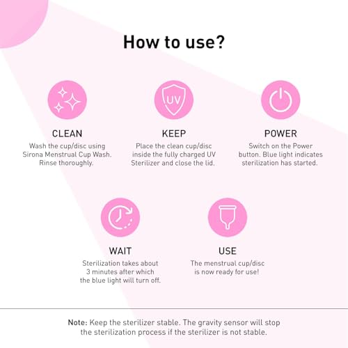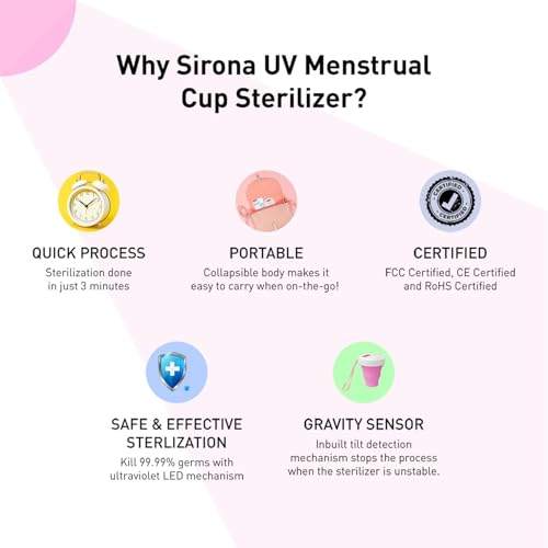 • Quick: Three minutes. That’s how long the sterilization process of the menstrual cup takes from start to finish in Sirona’s UV Sterilizer. Quicker than boiling water and setting up an electronic device with wiring could ever be!