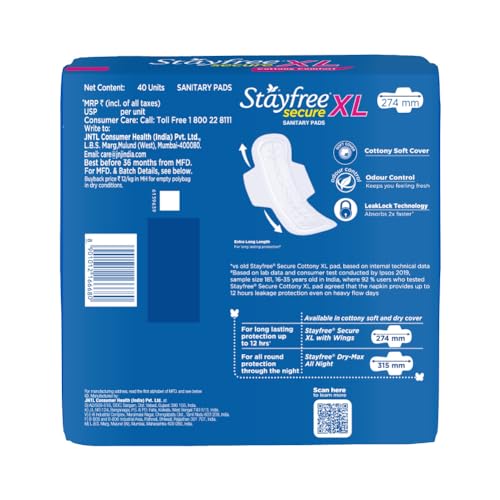 With your days full of things which you want to do periods should be the last thing on your mind. With the Best Ever Stayfree Secure Cottony XL you get long lasting protection from leakage and locks in wetness for up to 12 hours so that you donât have to stop. These Extra large pads provide extra protection and the LeakLock technology helps absorbs 2x faster so you donât feel wet. The Stayfree Secure Cottony XL pads have a cottony cover that is gentle on your skin and helps prevent rashes. The odour control system keeps you feeling fresh. Do away with the icky icky wet feeling with the Stayfree Secure Cottony XL pads now!