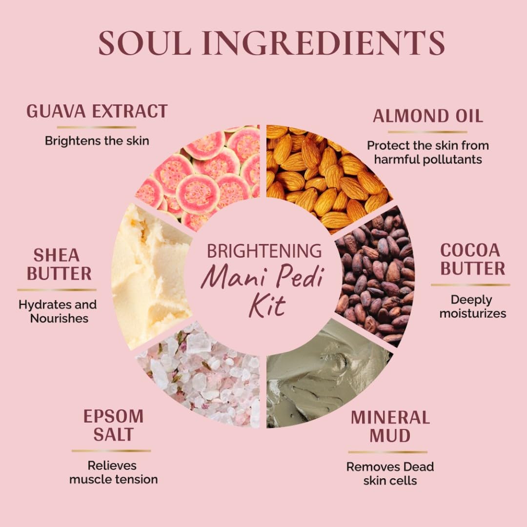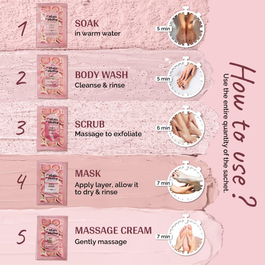 De-tan with guava spice and everything nice When fresh guava meets oh-so-spicy chili along with a rich dose of Vitamin C you can fade your tan easily. Get refreshed bright skin that's no tan and all smiles. This DIY 5 step mani-pedi kit contains soak body wash scrub Fancy Coverand massage cream. It is a premium one-time kit that will make you say ta-ta to your tan and hello to your glow. Guava's antioxidant may protect yourskinfrom damage which can slow down its aging process. Vitamin C protect skin from free-radical damage and signs of aging. How to use the product: Soak: warm water and dip hands/feet Body Wash: Work up lather. Massage and rinse. Scrub: Gently massage to exfoliate. Thoroughly rinse. : Apply a thin layer on the skin. Allow it to dry and then rinse. Massage Cream: Gently massage.