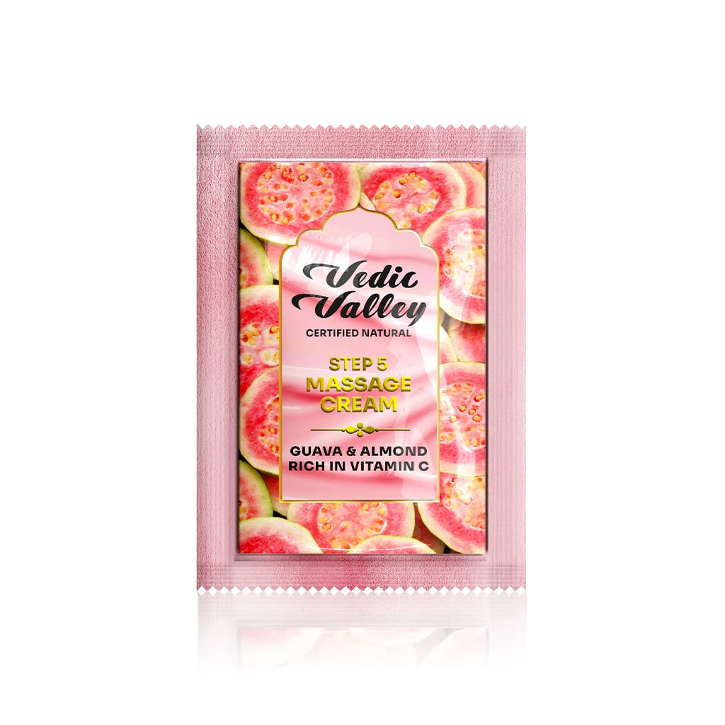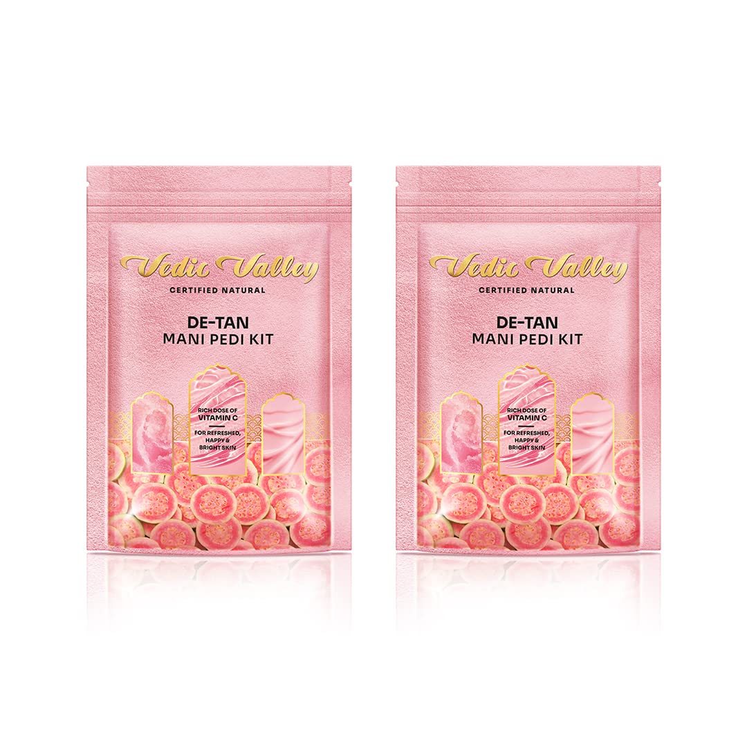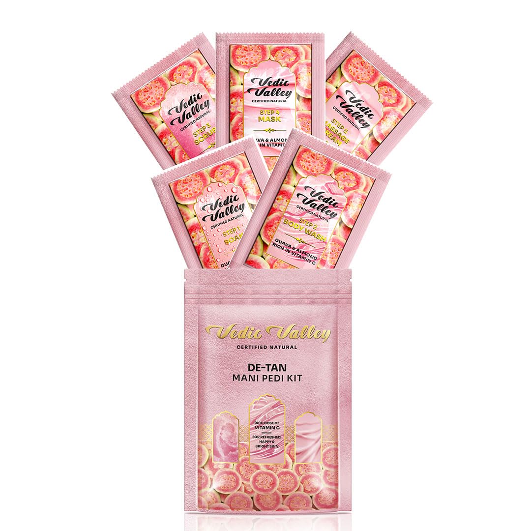 De-tan with guava spice and everything nice When fresh guava meets oh-so-spicy chili along with a rich dose of Vitamin C you can fade your tan easily. Get refreshed bright skin that's no tan and all smiles. This DIY 5 step mani-pedi kit contains soak body wash scrub Fancy Coverand massage cream. It is a premium one-time kit that will make you say ta-ta to your tan and hello to your glow. Guava's antioxidant may protect your skin from damage which can slow down its aging process. Vitamin C protects skin from free-radical damage and signs of aging. How to use the product: Soak: warm water and dip hands/feet Body Wash: Work up lather. Massage and rinse. Scrub: Gently massage to exfoliate. Thoroughly rinse : Apply a thin layer on the skin. Allow it to dry and then rinse. Massage Cream: Gently massage.