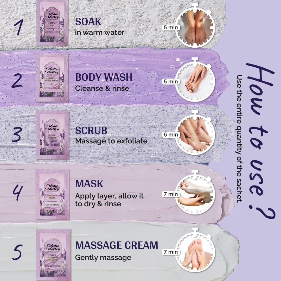 Lavender & Chamomile: Lavender and chamomile will give you a tan-free feel Let fragrant lavender and calming chamomile relax your senses and de-tan your skin with a soothing deep cleanse. It's finally time to . Relax. Repeat. This DIY 5 step mani-pedi kit contains soak body wash scrub Fancy Coverand massage cream. It is a premium one-time kit that will make you say ta-ta to your tan and hello to your glow. Lavender helps cleanse your skin and lessen redness and irritation. Chamomile fade spots eliminate acne scars and fight breakouts Apple & Honey: An apple a day keeps the tan away A fresh crop of handpicked apples and a dash of sweet honey work with the goodness of Vitamin A to peel away the excess and give you a deep de-tan. Let your skin feel young wild and tan-free! The collagen and the elastic in the applesarevital for keeg the skin youthful. Honey helps to remove dead cells on theskin. Guava & Chilly : De-tan with guava spice and everything nice When fresh guava meets oh-so-spicy chili along with a rich dose of Vitamin C you can fade your tan easily. Get refreshed bright skin that's no tan and all smiles. This DIY 5 step mani-pedi kit contains soak body wash scrub Fancy Coverand massage cream. It is a premium one-time kit that will make you say ta-ta to your tan and hello to your glow. Guava's antioxidant may protect your skin from damage which can slow down its aging process. Vitamin C protects skin from free-radical damage and signs of aging. How to use the product: Soak: warm water and dip hands/feet Body Wash: Work up lather. Massage and rinse. Scrub: Gently massage to exfoliate. Thoroughly rinse : Apply a thin layer on the skin. Allow it to dry and then rinse. Massage Cream: Gently massage.