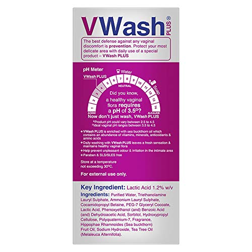 VWash Plus Expert Intimate Hygiene 200ml Hygiene Wash for Women Vaginal Wash Prevents Itching Irritation & Dryness Suitable For All Skin TypesThe best defence against any vaginal discomfort is prevention. Protect your most delicate area with daily use of a special product â VWash PLUS Expert Intimate Hygiene 200ml. With a pH of 3.5 V Wash restores pH in the intimate area and helps to prevent irritation itching and dryness in the intimate area. VWash is 100% soap-free and has no Paraben & SLS/SLES. Now donât just wash VWash PLUS. Why should you regularly use an intimate wash for women? With a pH of 3.5 VWash plus restores the pH balance in the intimate area and helps prevent irritation itching and dryness. The intimate area has a natural protective layer which is acidic in nature to help prevent infection. This layer is maintained when good bacteria called lactobacilli produce Lactic acid which maintains the acidic environment at a pH value of 3.5 to 4.5. This promotes the growth of lactobacilli inhibiting the presence of harmful bacteria and preventing infection. A healthy vaginal flora requires a pH of 3.5 - 4.5. VWash Plus- an intimate wash for women has lactic acid which restores vaginal pH balance whereas most soaps have a pH value of 8 & above. The daily use of soap to cleanse the vaginal area may upset ideal pH balance of the intimate area. This may lead to vaginal discomforts like dryness irritation & itching and could eventually lead to vaginal infections. VWash plus is an intimate wash for women that helps prevent unpleasant odour & irritation in the intimate area. Why is V Wash for women the best feminine wash? VWash PLUS has lactic acid which restores vaginal pH balance and is enriched with sea buckthorn oil & Tea Tree Oil which contains an abundance of vitamins minerals antioxidants & amino acids. Daily washing with VWash PLUS leaves a fresh sensation & maintains healthy vaginal flora. Vwash also helps prevent unpleasant odour & irritation in the intimate area. It is safe for daily use. VWash Plus is usable during periods as well.VWash Plus Expert Intimate Hygiene 100ml Hygiene Wash for Women Vaginal Wash Prevents Itching Irritation & Dryness Suitable For All Skin TypesThe best defence against any vaginal discomfort is prevention. Protect your most delicate area with daily use of a special product â VWash PLUS Expert Intimate Hygiene 100ml. With a pH of 3.5 V Wash restores pH in the intimate area and helps to prevent irritation itching and dryness in the intimate area. VWash is 100% soap-free and has no Paraben & SLS/SLES. Now donât just wash VWash PLUS. Why should you regularly use an intimate wash for women? With a pH of 3.5 VWash plus restores the pH balance in the intimate area and helps prevent irritation itching and dryness. The intimate area has a natural protective layer which is acidic in nature to help prevent infection. This layer is maintained when good bacteria called lactobacilli produce Lactic acid which maintains the acidic environment at a pH value of 3.5 to 4.5. This promotes the growth of lactobacilli inhibiting the presence of harmful bacteria and preventing infection. A healthy vaginal flora requires a pH of 3.5 - 4.5. VWash Plus- an intimate wash for women has lactic acid which restores vaginal pH balance whereas most soaps have a pH value of 8 & above. The daily use of soap to cleanse the vaginal area may upset ideal pH balance of the intimate area. This may lead to vaginal discomforts like dryness irritation & itching and could eventually lead to vaginal infections. VWash plus is an intimate wash for women that helps prevent unpleasant odour & irritation in the intimate area. Why is V Wash for women the best feminine wash? VWash PLUS has lactic acid which restores vaginal pH balance and is enriched with sea buckthorn oil & Tea Tree Oil which contains an abundance of vitamins minerals antioxidants & amino acids. Daily washing with VWash PLUS leaves a fresh sensation & maintains healthy vaginal flora. Vwash also helps prevent unpleasant odour & irritation in the intimate area. It is safe for daily use. VWash Plus is usable during periods as well.