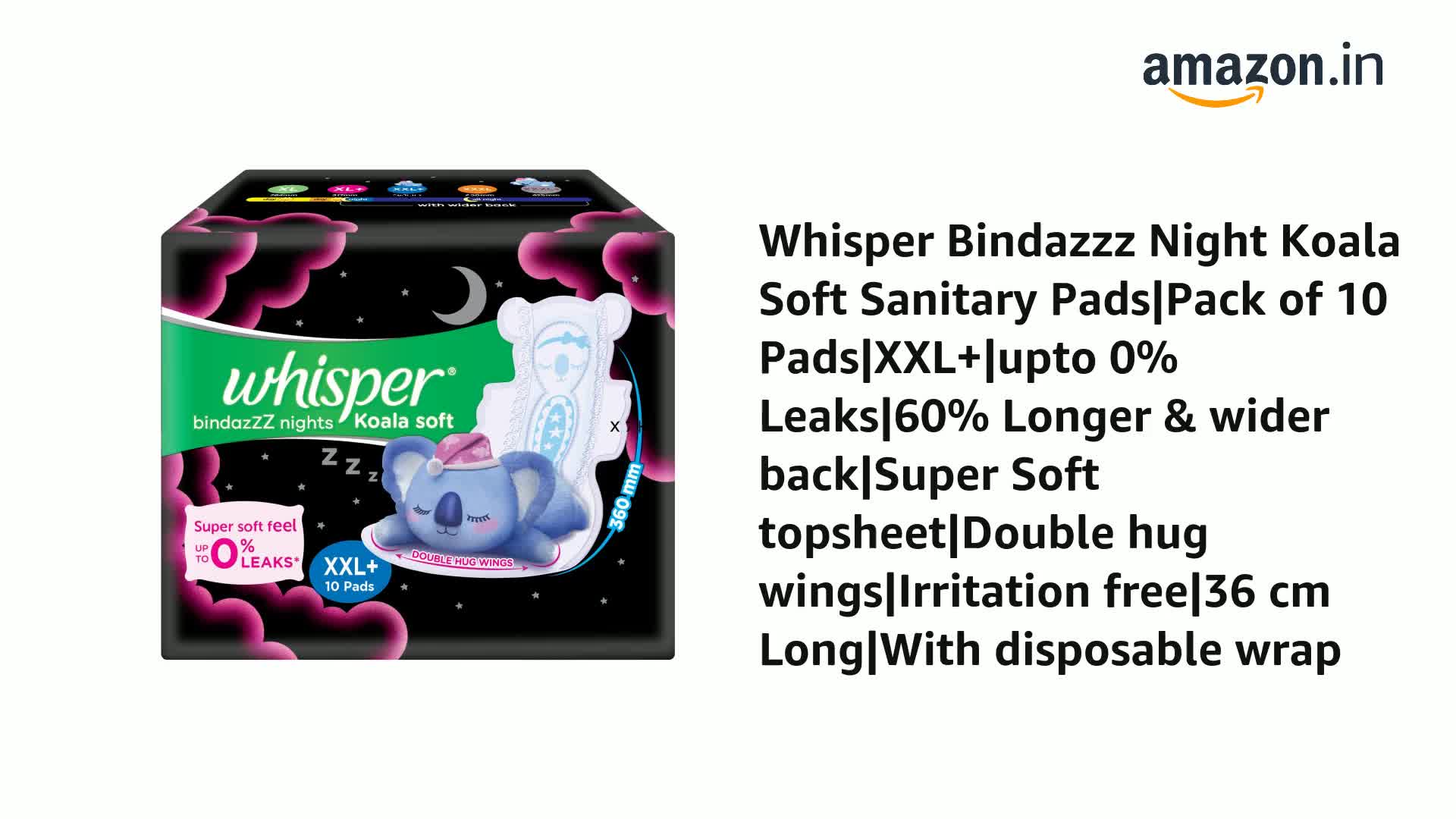 WHISPER BINDAZZZ NIGHTS KOALA SOFT SANITARY PADS, 10 XXL+ PADS, UPTO 0% LEAKS, 60% LONGER & WIDER BACK, SUPER SOFT TOPSHEET, DOUBLE HUG WINGS, DISPOSABLE WRAPPER, for Women
