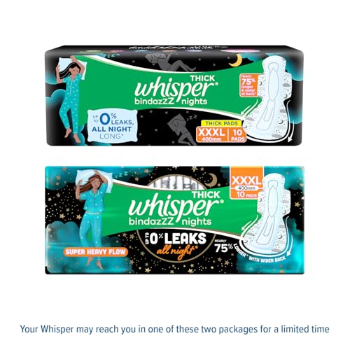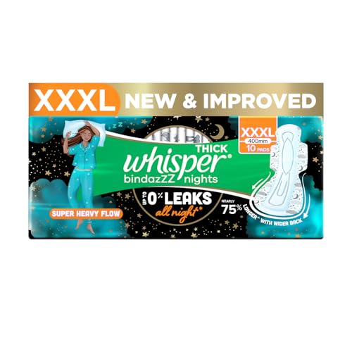 Whisper Bindazzz Night Sanitary Pads|10 Thick Pads|XXXL|upto 0% Leaks|Suitable for Heavy Flow|75% Longer & Wider back|Comfortable Cushiony soft wings|40 cm Long|With disposable wrap