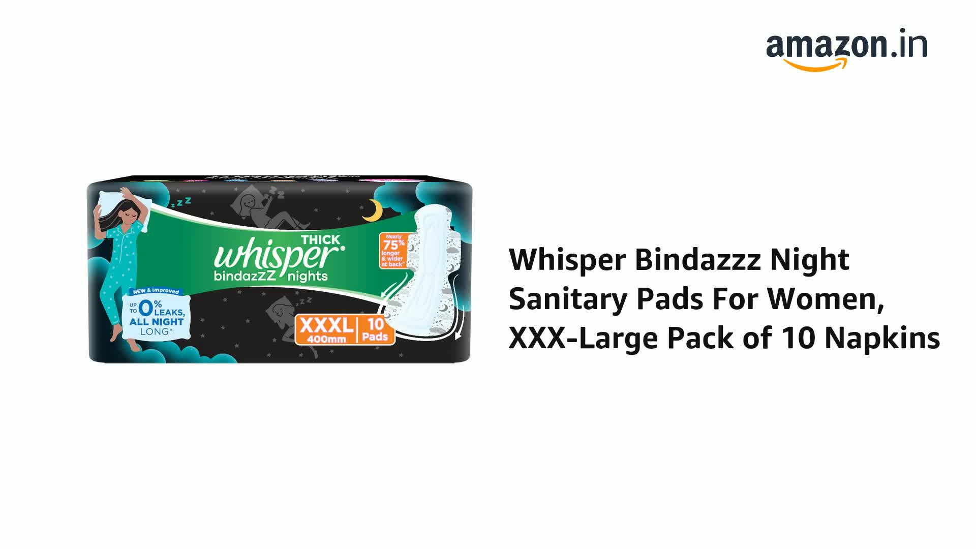 Whisper Bindazzz Nights ensures upto 0% leaks all night long. In order to manage night-time flow these pads are nearly 75% longer and have a wider back so you are covered from leaks from all sides.