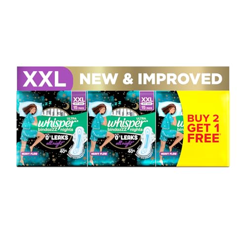 HomeHealth & PersonalPersonal CareWomen WellnessWhisper Bindazzz Nights 15x3 XXL Sanitary Pads, Upto 0% Leaks All Night Long, For Heavy Flow, Nearly 40% Longer with Wider Back, Active odor lock so you feel fresh, Disposable Wrapper