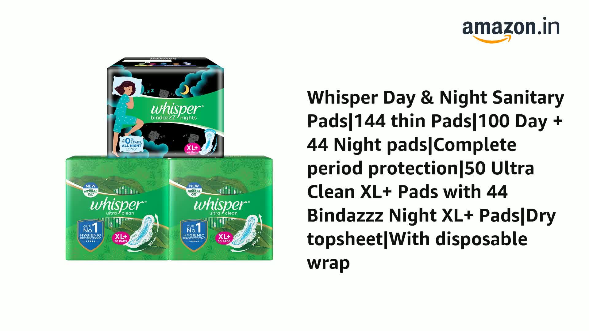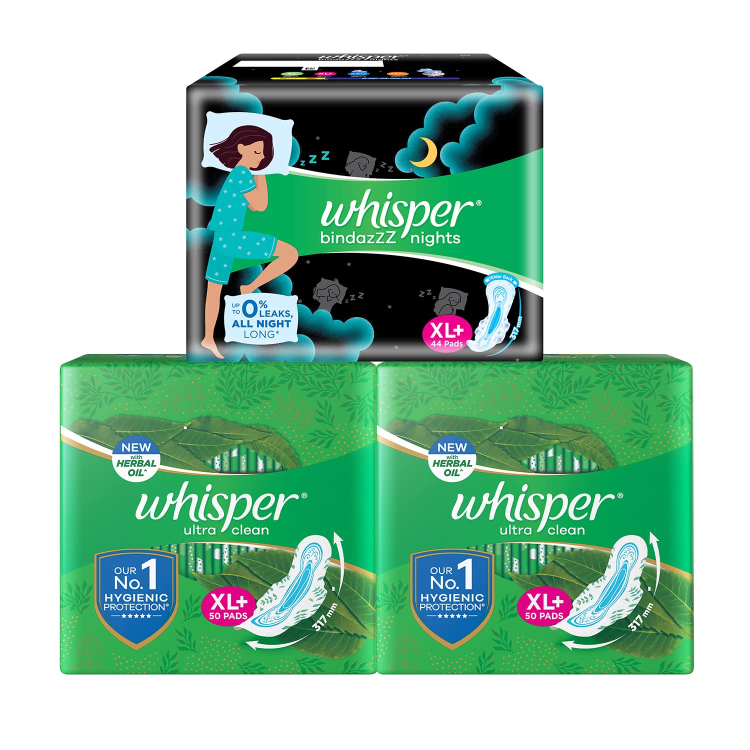 Whisper Ultra Clean is our No 1 Hygienic Protection Range now with Herbal Oil and locks not just wetness but also odour. The pads are nearly 40% longer versus ordinary pads for long lasting coverage and have a DRI weave cover that absorbs in seconds with a delightful scent for all day freshness and Whisper Bindazzz Nights ensures upto 0% leaks all night long. Whisper Bindazzz Nights pad is 40% longer and has a wider back so you are covered from leaks from all sides.