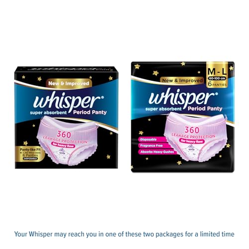 HomeHealth & PersonalPersonal CareWomen WellnessWhisper Super Absorbent Period Panty, 6 M-L Pants, 360 Degree Leakage Protection for Heavy Flow, Panty like Fit for Full back Coverage, Absorbs Heavy Gushes, Silky Soft, Comfortable Feel