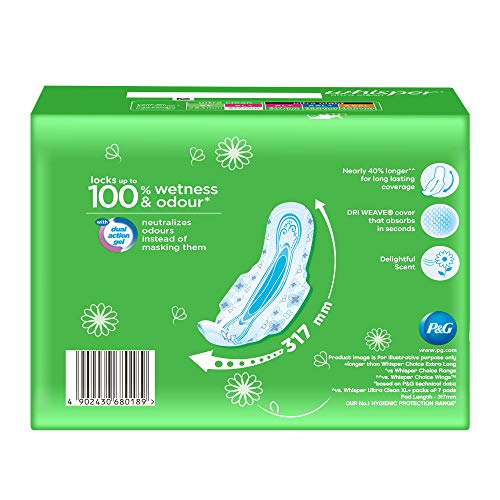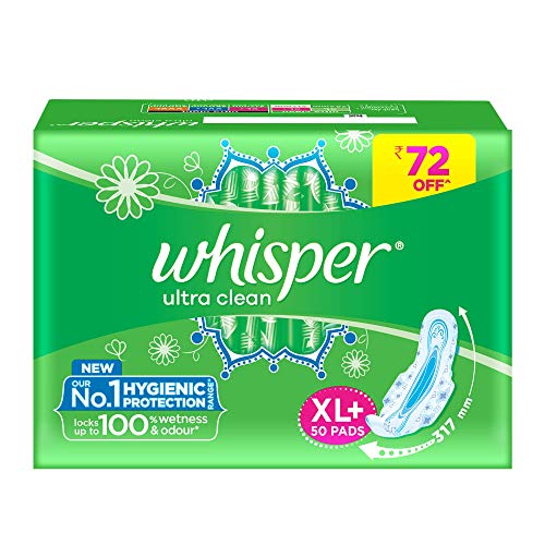 Whisper Ultra Clean Sanitary Pads for Women XL+ 50 NapkinsIt's about living your life by your own rules despite what society says. It's about choosing for yourself every day of the month. This revolutionary product whisper ultra clean xl+ has odour lock gel that locks upto wetness and even odours and gives you the freedom to live life by your own rules even during periods. Because meri life mere rules.Whisper Ultra Soft Sanitary Pads for Women XL 50 NapkinsWhisper Ultra Soft Air fresh gives you airy freshness for irritation free feel. It has 500 air fresh pores for an airy feel on skin. Dermatologically tested.