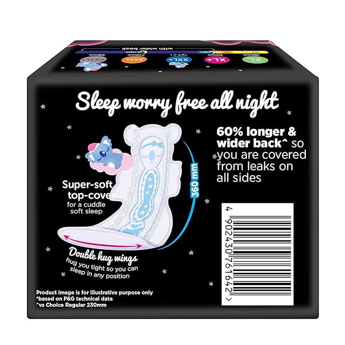 Whisper Bindazzz Nights Koala Soft Pad ensures upto 0% leaks. In order to manage night-time flow, these pads are nearly 85% longer and have a wider back so you are covered from leaks from all sides.