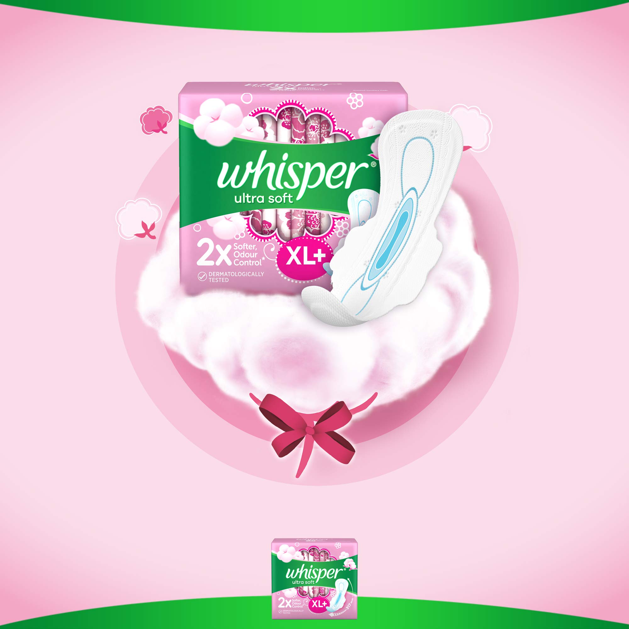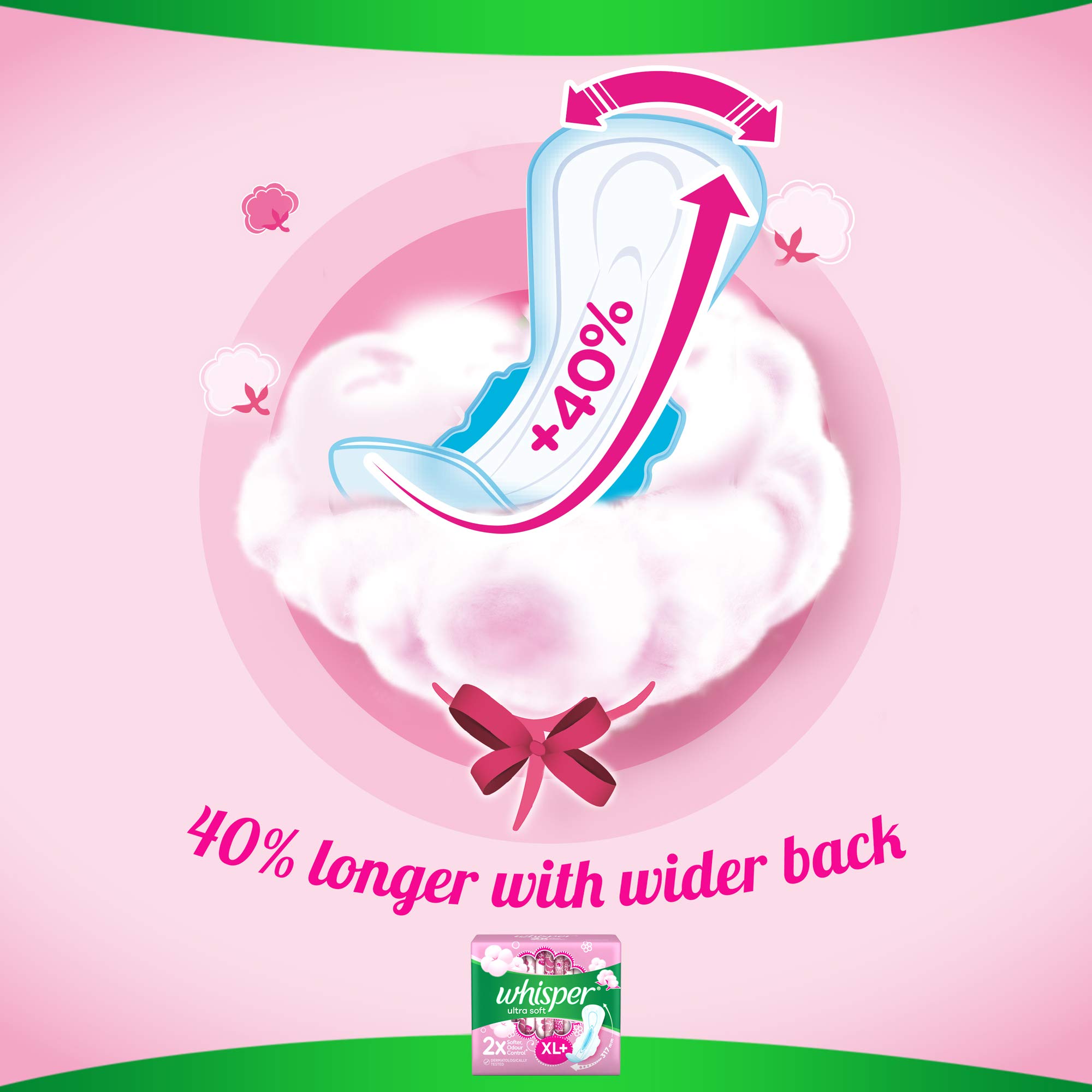 Feel comfortable with whisper ultra soft sanitary pads with wings. For extra gentleness on your skin whisper ultra soft pads are two times softer and contain a soft top sheet in both the centre and wings. With whisper ultra soft pads your skin will get all the care it needs and you'll get all the confidence you deserve. These pads are nearly 40% longer and have soft pores that drive liquid to the core and lock it away so you have extra coverage and long-lasting protection. The stretchable wings in whisper ultra soft pads wrap around your panties to keep the pad in place while the fresh odourless pearls capture and lock away period odour.