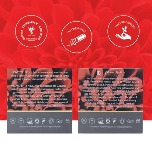 100 percent free of petrochemicals phthalates toxic ingredients artificial fragrance and colour. Am a light non greasy day cream enriched with SPF 5. My preparation packed with natural source of vitamin c protects while the pomegranate juice strengthen the skin's upper layer. Shea butter and aloe vera gel balances and moisturises the skin to replenish the moisture lost during the day; extracts of orange apple and algae rich in mineral and natural enzymes helps to lighten and hydrate the skin. The powerful blend of chamomile lavender and helichrysum essential oils together with avocado oil offer optimum sun protection. Leave your skin soft supple and exquisite every single day.