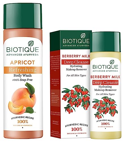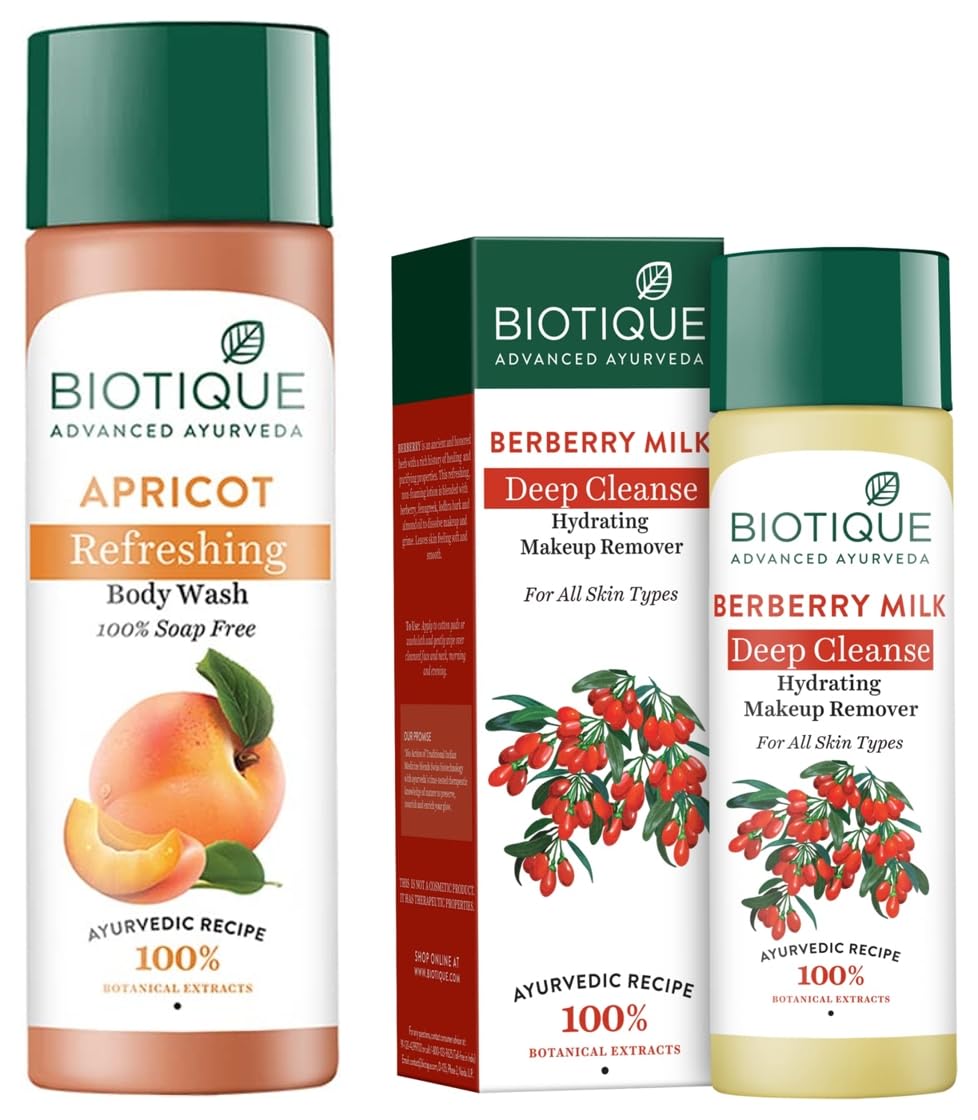 Biotique Bio Apricot Refreshing Body Wash 190mlBiotique Bio Apricot 100% Soap Free Refreshing Body Washÿis a soap free cleanser which contains apricot kernel oil wild turmeric turmeric kurchi and soap nut. Apricot is great for exfoliating the skin. With apricot gel your skin looks perfectly cleaned without being hydrated. It removes all microbes and pollutants with drying the skin unlike other soaps. Because of its soothing quality it can be used as an excellent alternative to the soap as cleanses the body with softness.Biotique Bio Berberry Hydrating Cleanser For All Skin Types 120MlA non-foaming effective blend of herbal extracts with natural oils that deep cleanses the skin. Contains Berberry Red Sandalwood fenugreek Lodhra Bark & Almond Oil. It dissolves makeup and grime. Leaves skin feeling soft and smooth.