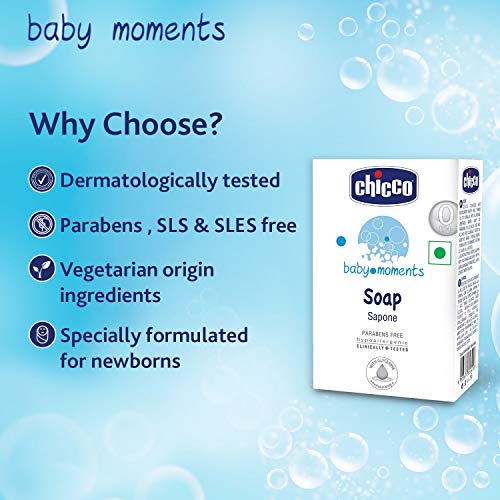 • Chicco Baby Moments Soap with its hydrating and moisturising formula nourishes baby's bath so that baby's skin stays soft all day long. A bath full of love and care