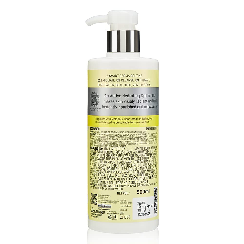 Dermafique Hydra Soft Body Wash is an Active Hydrating System that helps provide 24 Hour Moisturized & Luminous looking skin. This formulation with its NMF (Natural Moisturizing Factor) Technology makes skin visibly radiant and feel instantly nourished & moisturized. It contains Vitamin E and Chamomile and has a Skin-friendly pH. It is o clinically tested to be suitable for sensitive skin. The Body wash has been formulated to contain No Paraben and No SLS/ SLES. It has a fragrance that is designed with Malodour Counteraction Technology. The product has been dermatologically tested on Indian Skin. Usage: Work into a rich lather gently spread over body and rinse-off. Dermafique encourages you to follow its Smart Derma Routine: 01 Exfoliate. 02 Cleanse. 03 Hydrate. For a Healthy Beautiful Zen-like Skin