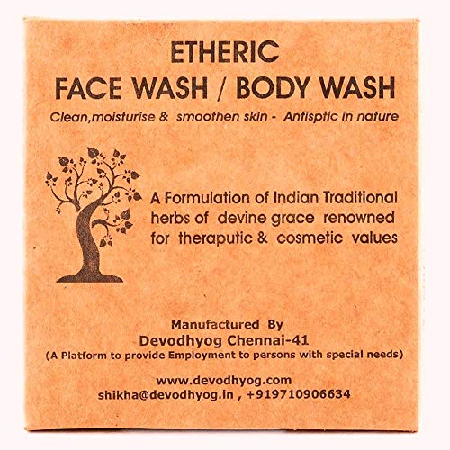 Devodhyog proudly presents Etheric Face & Body Wash Herbal Powder (75 gms). Etheric Face and Body wash consists - Rose petals Sandal wood powder Kasuri haldi Orange peel Neem leaf and Suganda kachooralu (Curcuma zedoaria ) Sun dry green moong dal horsegram chick peas Multani mitti powder. Etheric face/ body wash is an excellent product has been developed with divine natural herbs to nourish skin every time you use it.Its ultra nourishing ingredients leaves your face glowing while its natural sun-screen and fairness enhancer it also protects you from the sun.The anti-bacterial and anti-pruritic agents keep your skin healthy& fresh. It can also be used as a quick short facial also.