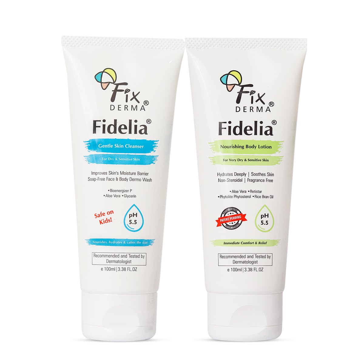 Fidelia Gentle Skin Cleanser and Nourishing Body Lotion Combo is a dynamic pairing that will revolutionize your skincare routine. Both products are infused with skin-soothing ingredients that help to soothe and calm inflamed irritated and sensitive skin. Our Fidelia Gentle Skin Cleanser gently cleanses your skin removing impurities and unclogging pores leaving you fresh and revive. Paired with our skin-hydrating and nourishing body lotion your skin will get the ultimate rejuvenation and deep hydration. The cream is packed with healing power which soothes and repairs reducing redness. Along with this it contains RetiStar which the early signs of aging and promotes healthy skin. Both these formulations are non-greasy non-comedogenic and suit all skin types.