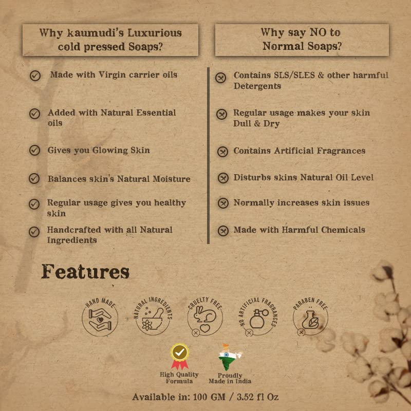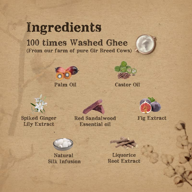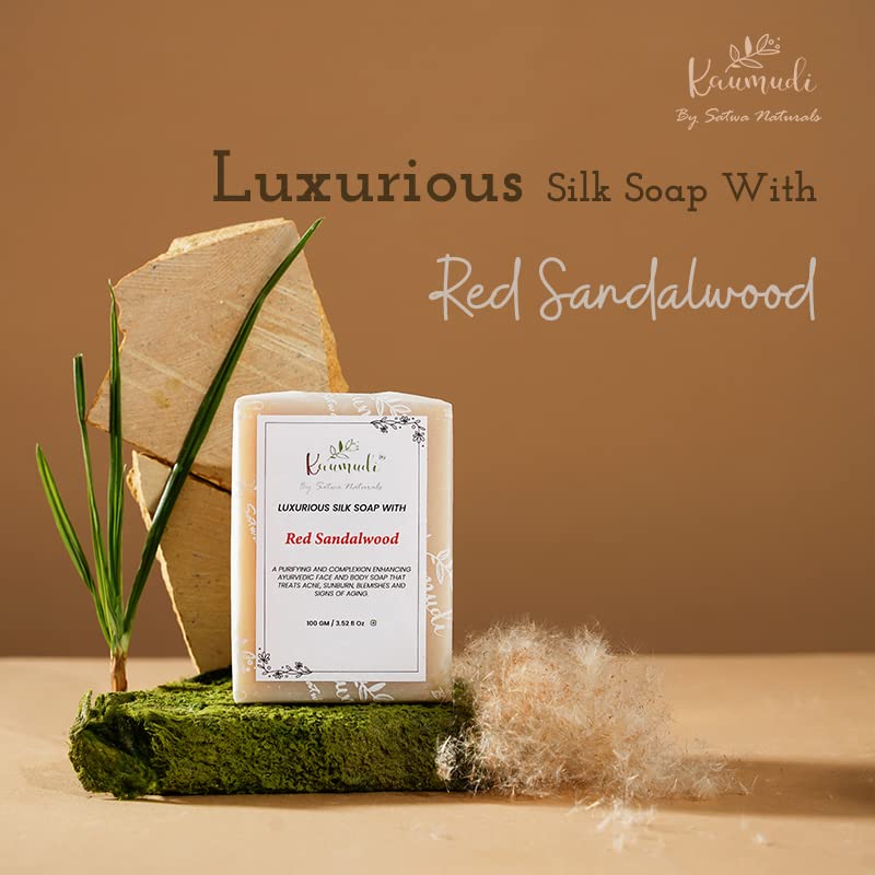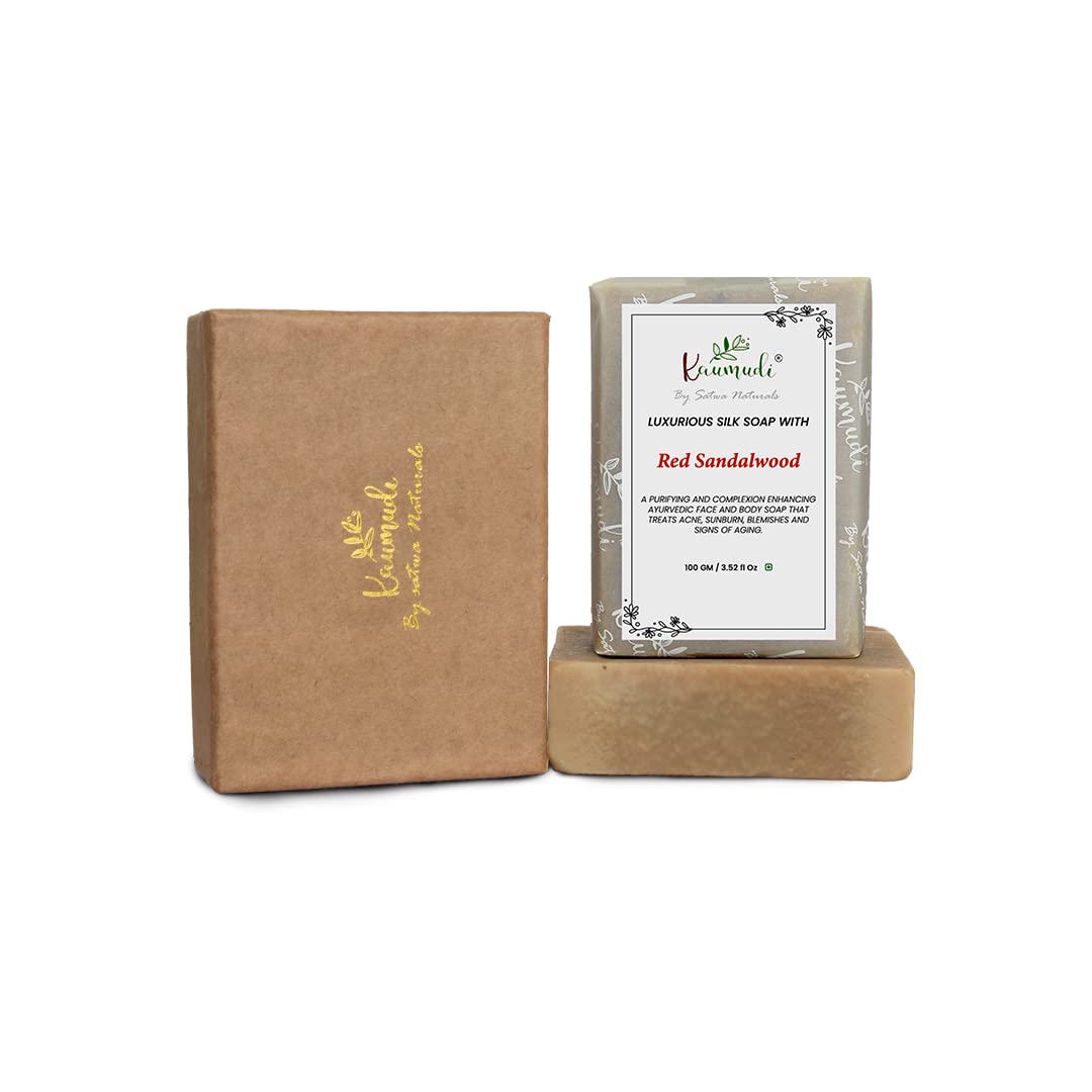 Our Luxurious Silk with Red Sandalwood is an all natural cleanser that works perfectly to uplift dry and dull skin but works quite well for other skin types as well. The goes deep into the skin to clear impurities from the inside and the outside. The beautiful fragrance of sandalwood is enough for it to become your choice of in the shower. The bar is blended with essential ayurvedic ingredients that are incredibly beneficial to the skin. The formulation uses 100 times washed ghee from our pure Gir breed cow farm as a base ingredient. Ghee is an incredible ingredient for the skin because it lightens the skin hydrates the skin and even hethe skin. With regular use you will feel an incredible change in your skin tone and texture. Apart from creating a more even skin tone the o helps restore the natural glow of your skin. Give the gift of beauty to your skin with our Luxurious Silk with Red Sandalwood.