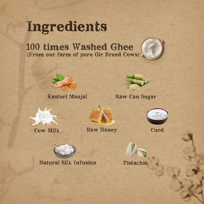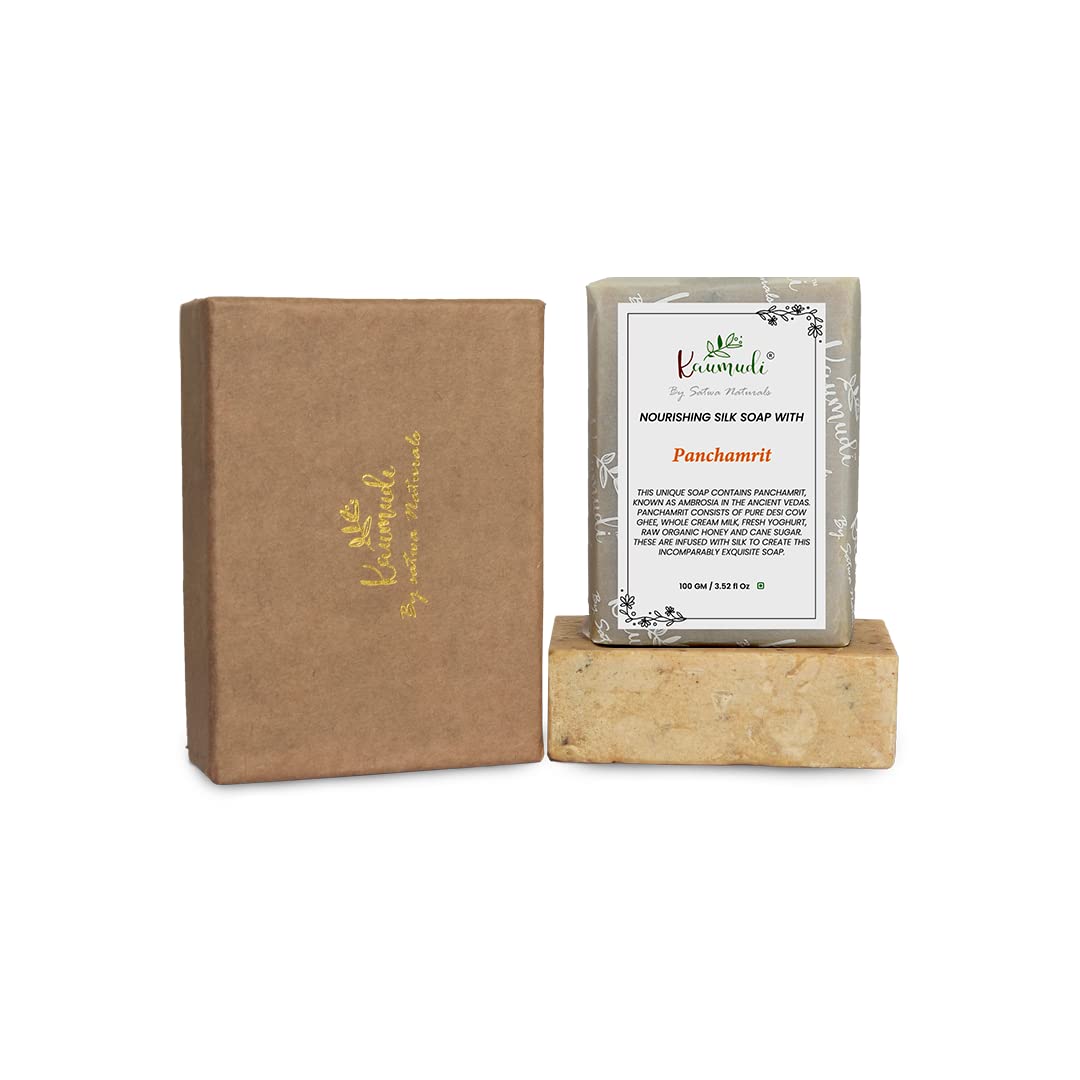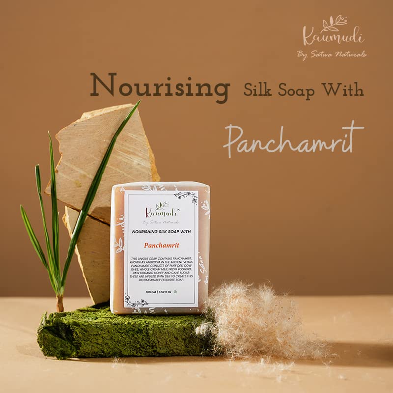 Our Nourishing Silk with Panchamrit unlocks the ancient secrets of Ayurveda to give you healthy glowing skin. Panchamrit consists of 5 essential ingredients: Milk Yogurt Raw Honey Cane Sugar and pure Desi Ghee. Each ingredient in Panchamrit is carefully chosen to give your skin an extravagant experience right at home. The 100 times washed ghee used in this is sourced directly from our farm which is home to pure Gir breed cows. The highest quality ingredients are brought together to create this beautiful bar of that gives you bright skin that is free of all blemishes. The deep nourishment and hydration provided by our is due to the natural ingredients that have been carefully brought together to give you a fragrant light and cleansing . Using this everyday helps you get skin that is cleansed gently but thoroughly along with an even skin tone and smooth skin texture. Our Nourishing Silk with Panchamrit is ideal for all skin types.