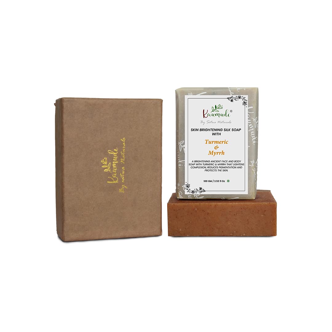 An Ayurvedic cleansing for dull damaged and hyper-pigmented skin. Turmeric is a powerful antioxidant and anti-agent that lightens skin tone s pigmentation and heblemishes. o contains a host of powerful Ayurvedic ingreThe Skin Brightening Silk with Turmeric & Myrrh is ideal for dealing with skin that has become dull damaged and shows hyperpigmentation. Our is formulated to make sure your skin experiences the maximum benefit of this age old ayurvedic creation. With turmeric the bar helps lighten dark spots and pigmentation in the skin. You get an even skin tone d blemishes and glowing skin! The exquisitely soft is incredibly gentle and can be used for all skin types. We use all natural ingredients such as banyan tree root extract and fig extract both of which help in purifying the skin to return your skin to its natural radiant state. While the bar is incredibly beneficial for your skin the light fragrance leaves you feeling fresh after each shower. An incredible benefit of our Myrrh infused is that it o has properties. The helps in healing any infections on the skin and soothes the skin and o helps blemishes. With our 100 times washed ghee sourced directly for our organic farm of pure Gir breed cows this bar will become a fixture in your daily routine. Give it a try and give your skin the chance to heal and glow. dients such as Banyan and Sacred Fig ("Peepal") which are ideal for purifying skin. pressed Extra Virgin Coconut Oil and natural Silk infusion which lightly nourish the skin keeg it soft hydrated and protected. Pure essential oils of Neroli Myrrh and Frankincense revive the skin and calm the senses. Using the finest natural ingredients and blends based on authentic Ayurvedic formulation these freshly prepared s incorporate unique processes including a ghee wash and a pure silk infusion