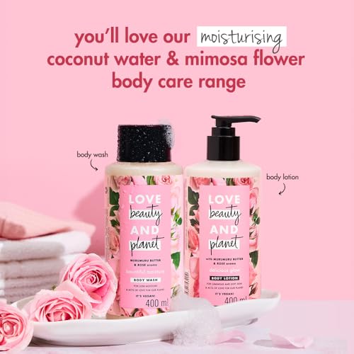 Our moisturizing Murumuru Butter and Rose Body Wash is made with no sulfates no parabens and is infused with plant-based cleansers leaving you and the planet a little more beautiful. Give your skin a fragrant kiss of nature with hand-picked Bulgarian roses ethically sourced from the rose valleys of Bulgaria. Our Bountiful Moisture Body Wash helps maintain skin moisture. How to use? You know it - squeeze lather rinse! Go easy on the tap. Our goal is a carbon footprint so small it's like we weren't even here. We at Love Beauty & Planet have started our journey by loading our products with natural goodness and packing it in bottles made from 100% recycled plastic. Our delicate scents are infused with natural and ethically sourced oils and extracts. All our bottles are made up of 100% recycled plastic waste and are completely recyclable. Our caps and pumps arent made from recycled plastics yet but were working on it. Our products are free from ed harsh chemiclike parabens dyes and sulfates. Love Beauty & Planet is PETA Certified cruelty-free and vegan. Globally Love Beauty & Planet does not test on anim. We are committed to small acts of love that make our planet cleaner greener and more beautiful.